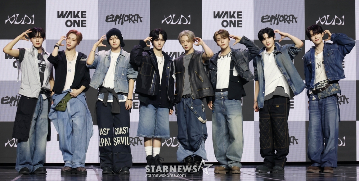 그룹 알파드라이브원(리오, 준서, 아르노, 건우, 상원, 씬롱, 안신, 상현)이 12일 오후 서울 용산구 블루스퀘어에서 진행된 미니 1집 ‘EUPHORIA’(유포리아) 발매기념 쇼케이스에서 포즈를 취하고 있다.