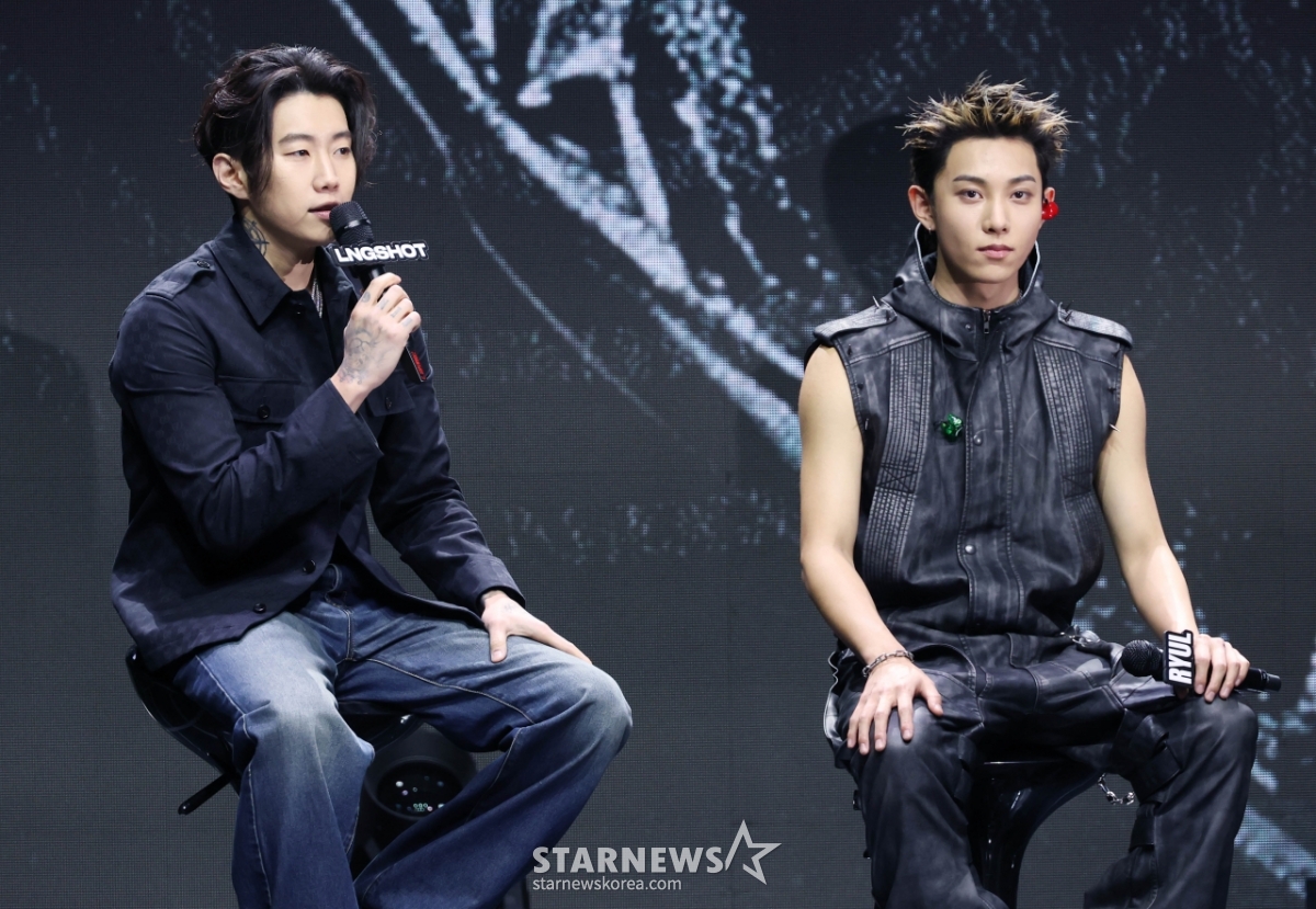 가수 박재범이 13일 오후 서울 영등포구 명화라이브홀에서 진행된 롱샷 데뷔 EP '샷 콜러스'(SHOT CALLERS) 발매기념 쇼케이스에서 멤버들과 대화를 하고 있다.