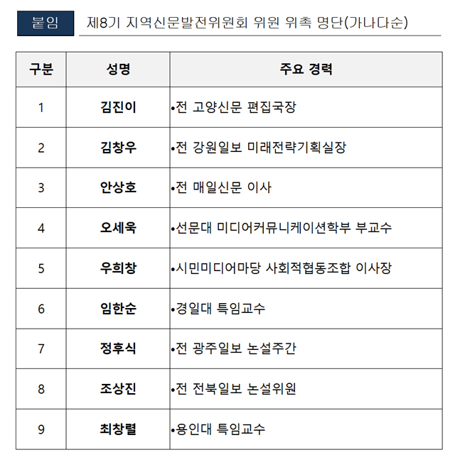 문체부와 국회 문화체육관광위원회, 언론 관련 단체(한국신문협회·한국기자협회·한국언론학회)가 각 3명을 추천해 언론 및 지역신문 관련 전문성과 현장 경험이 풍부한 인사를 중심으로 위촉했다.