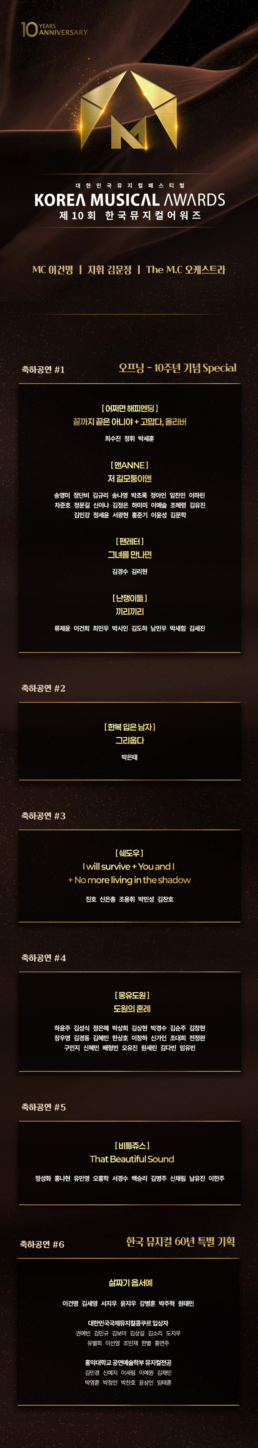 마지막 무대는 MC 이건명과 신인상 후보 배우 김세영, 서지우, 윤지우, 강병훈, 박주혁, 원태민이 함께한다. 또한 국제뮤지컬콩쿠르 입상자 권예빈, 김민규 등과 홍익대학교 공연예술학부 뮤지컬 전공 학생들이 참여한다. 이들은 한국 뮤지컬 60주년을 기념해 우리나라 최초 창작 뮤지컬 '살짜기 옵서예'를 재현한다.