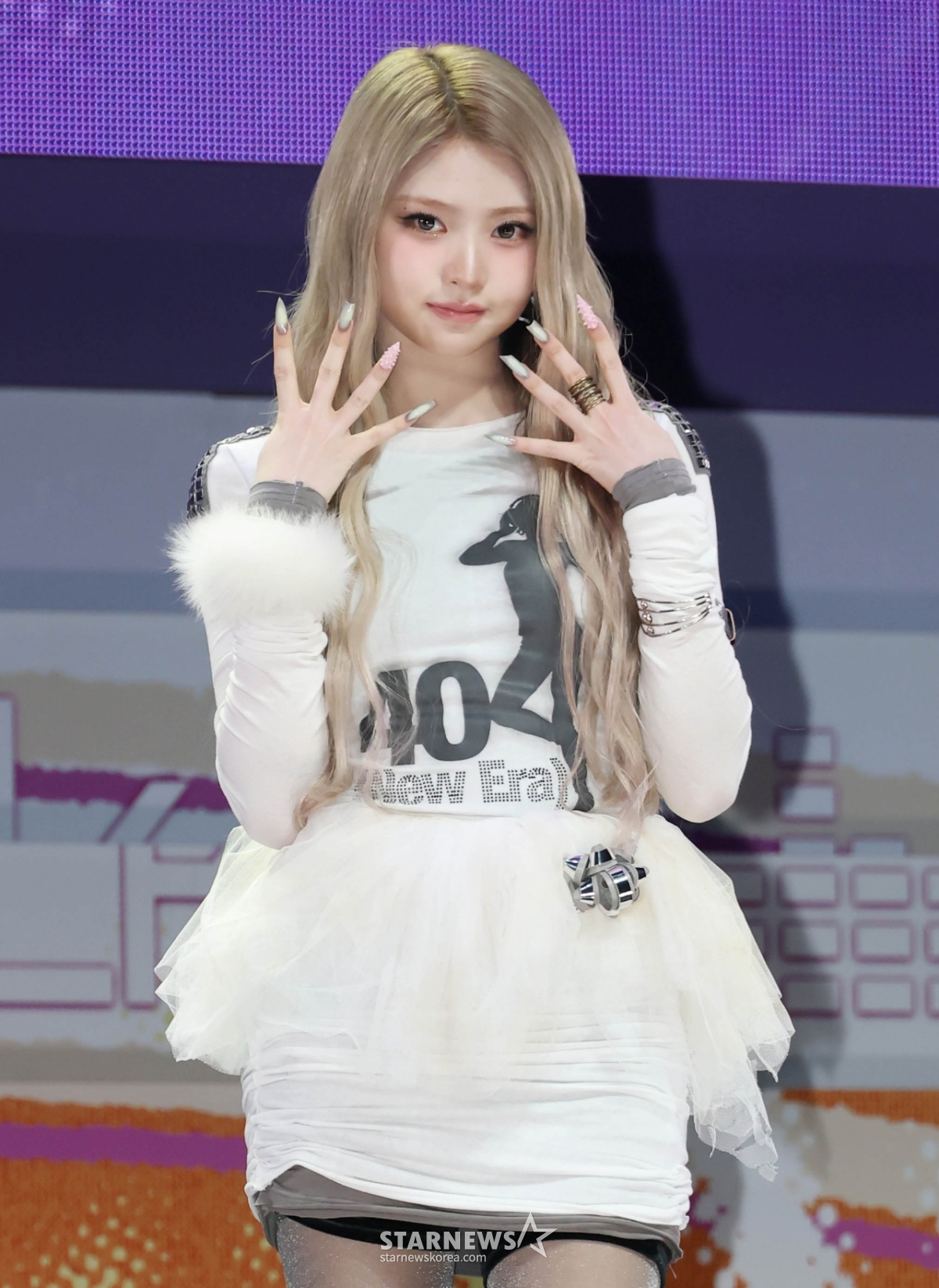 걸그룹 키키(KiiiKiii) 하음이 26일 오후 서울 광진구 예스24라이브홀에서 진행된 미니 2집 '델룰루 팩'(Delulu Pack) 발매기념 쇼케이스에서 포즈를 취하고 있다.