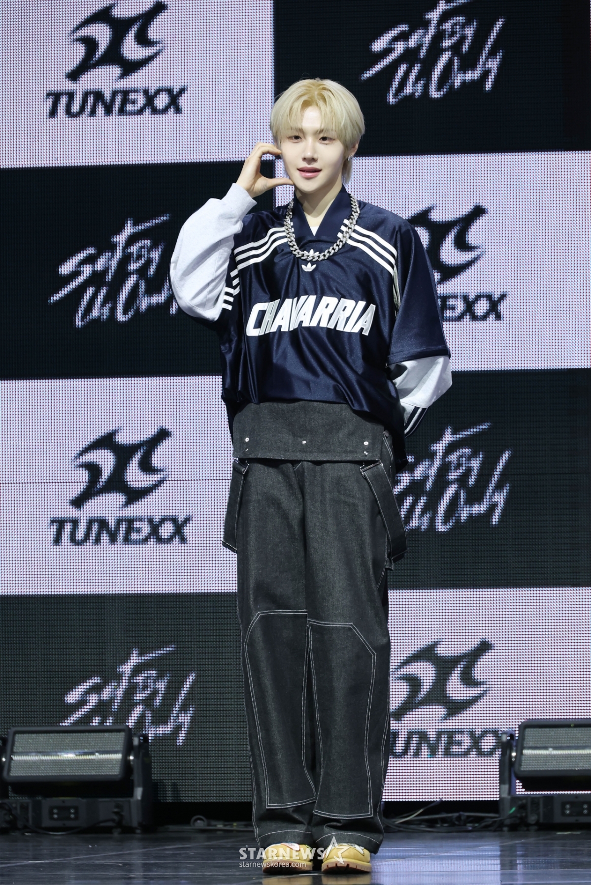 신인 보이그룹 '튜넥스'(TUNEXX) 시환이 3일 오후 서울 광진구 예스24라이브홀에서 진행된 데뷔 앨범이자 첫 미니앨범 ‘SET BY US ONLY' 발매기념 쇼케이스에서 포즈를 취하고 있다.