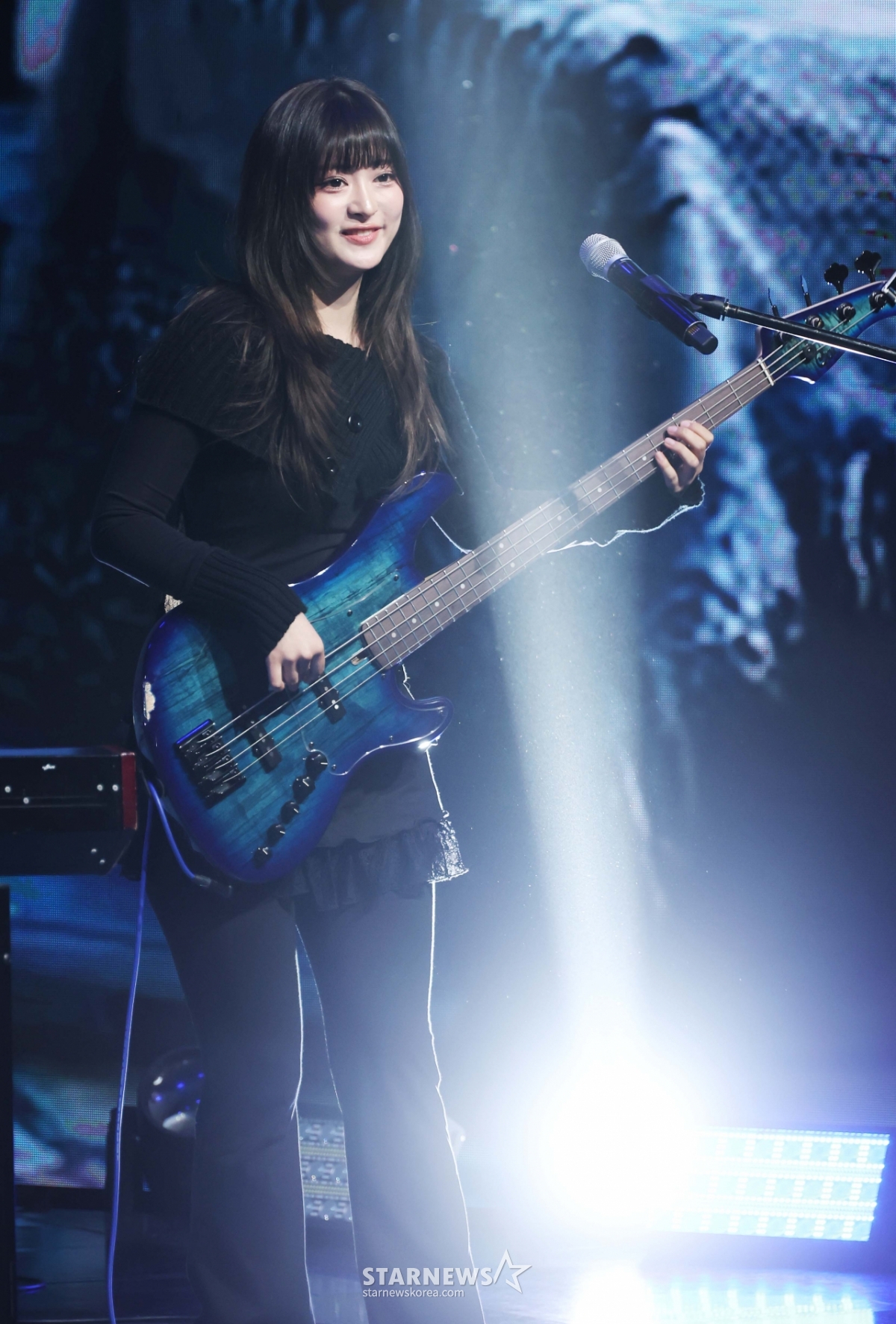 밴드 레이턴시(LATENCY) 베이시스트 세미가 18일 오후 서울 마포구 상암동 쇼킹케이팝센터에서 진행된 첫 미니앨범 '레이트 오'클락'(LATE O'CLOCK) 발매기념 쇼케이스에서 데뷔곡을 선보이고 있다.