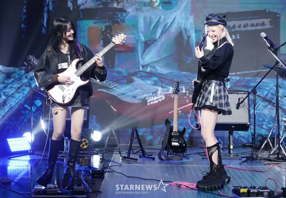 밴드 레이턴시(LATENCY) 희연, 지원이 18일 오후 서울 마포구 상암동 쇼킹케이팝센터에서 진행된 첫 미니앨범 '레이트 오'클락'(LATE O'CLOCK) 발매기념 쇼케이스에서 데뷔곡을 선보이고 있다.