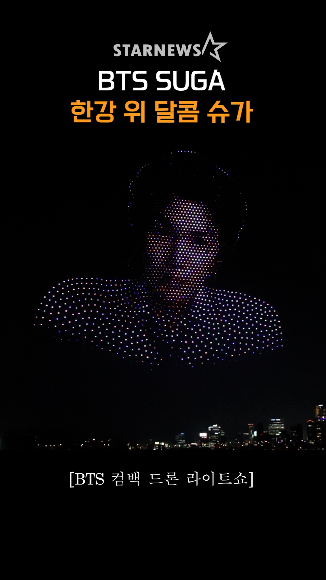 연예대중문화방탄소년단 슈가(BTS SUGA), '한강 위 달콤 슈가' [영상]발행 : 2026.03.20 ・ 21:22오찬우 기자20일 오후 서울 광진구 자양동 뚝섬한강공원에서 'BTS 컴백 드론 라이트쇼'가 열렸다. 2026.03.20<저작권자 © 스타뉴스, 무단전재 및 재배포 금지>브리핑20일 오후 서울 광진구 자양동 뚝섬한강공원에서 'BTS 컴백 드론 라이트쇼'가 열렸다. 이 행사는 방탄소년단 슈가와 관련하여 진행되었다. 2026년 3월 20일에 개최되었다.추천 기사오찬우 기자기자홈좋아요연예-대중문화의 인기 급상승 뉴스연예-대중문화의 최신 뉴스AD