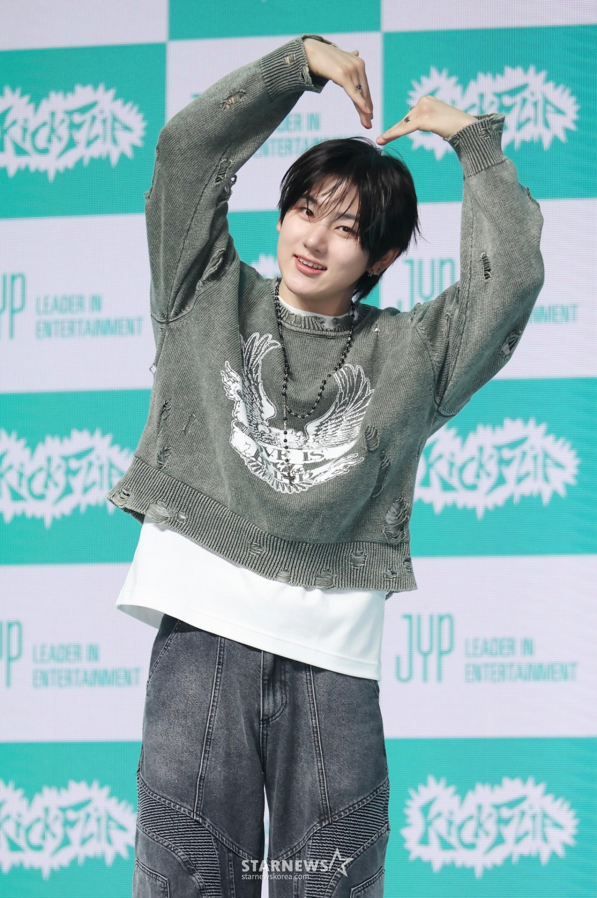 그룹 킥플립(KickFlip) 계훈이 6일 오후 서울 광진구 예스24라이브홀에서 진행된 네번째 미니앨범 '마이 퍼스트 킥'(My First Kick) 발매기념 쇼케이스에서 포즈를 취하고 있다.