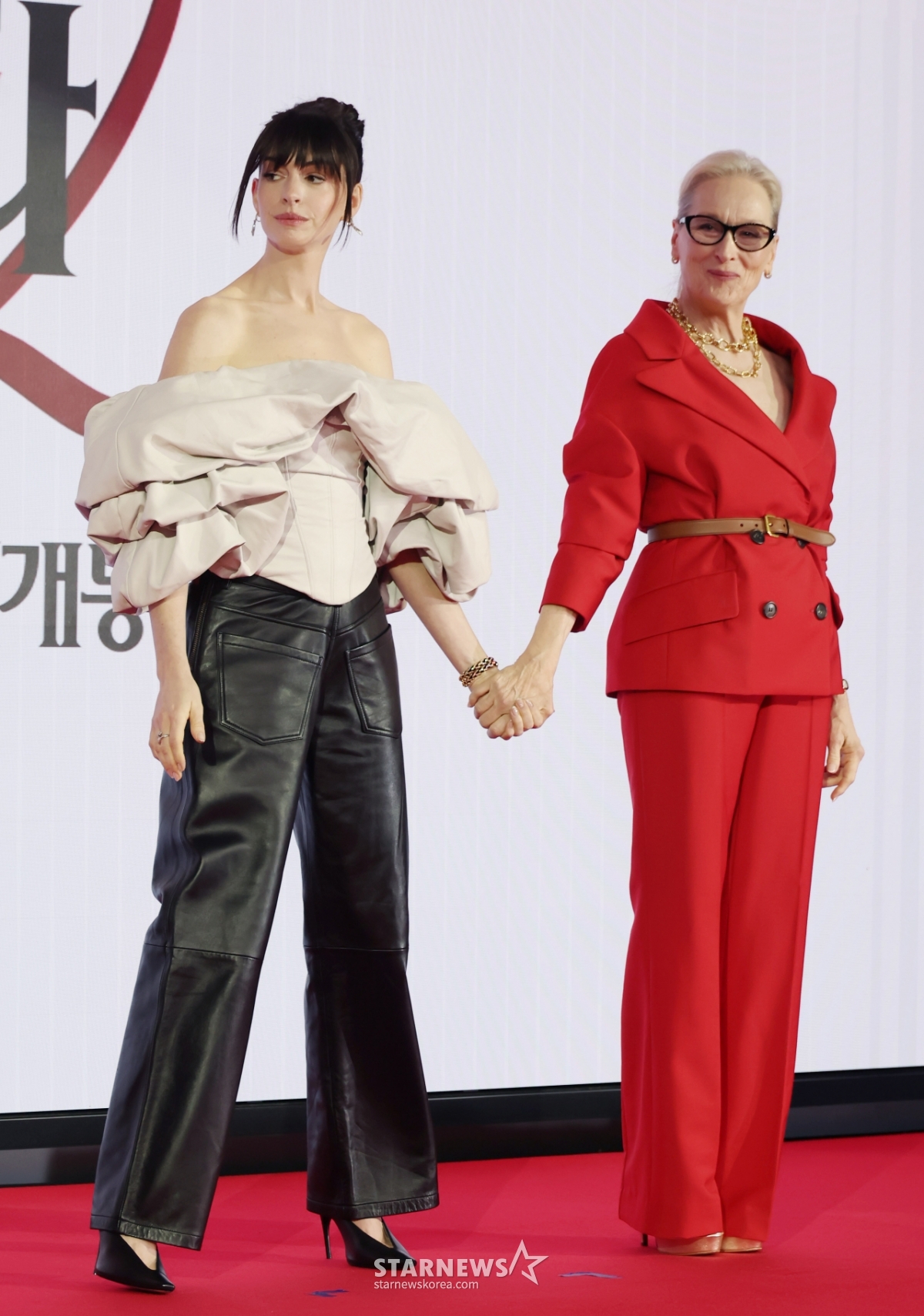 배우 앤 해서웨이, 메릴 스트립이 8일 오전 서울 종로구 포시즌스 호텔에서 진행된 영화 '악마는 프라다를 입는다 2' 내한 기자간담회에 참석해 포즈를 취하고 있다.