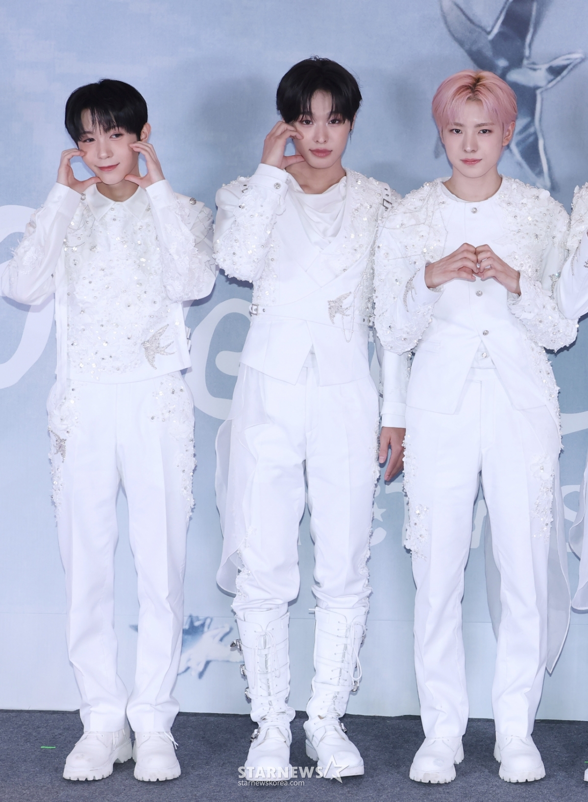 그룹 엔시티 위시의 료, 리쿠, 유우시가 19일 서울 올림픽공원 KSPO DOME에서 열린 기자간담회에 참석했다. 이들은 '엔시티 위시 퍼스트 콘서트 투어 인투 더 위시 : 아워 위시시' 앙코르 인 서울' 기자간담회에 앞서 포즈를 취했다. 료, 리쿠, 유우시는 사랑스러운 포즈를 선보였다.