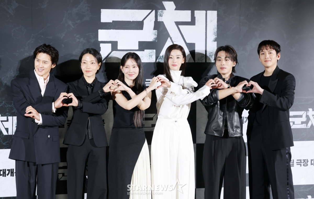Актёры Ко Су, Ким Шин Рок, Шин Хён Бин, Чон Джи Хён, Гу Бир и Чжи Чан Ук позируют на презентации производства фильма «Гунчхон (режиссер Сон Ён Хо)», которая состоялась 6-го числа в торговом центре CGV I-Park в Йонсан-гу, Сеул. /2026.04.06