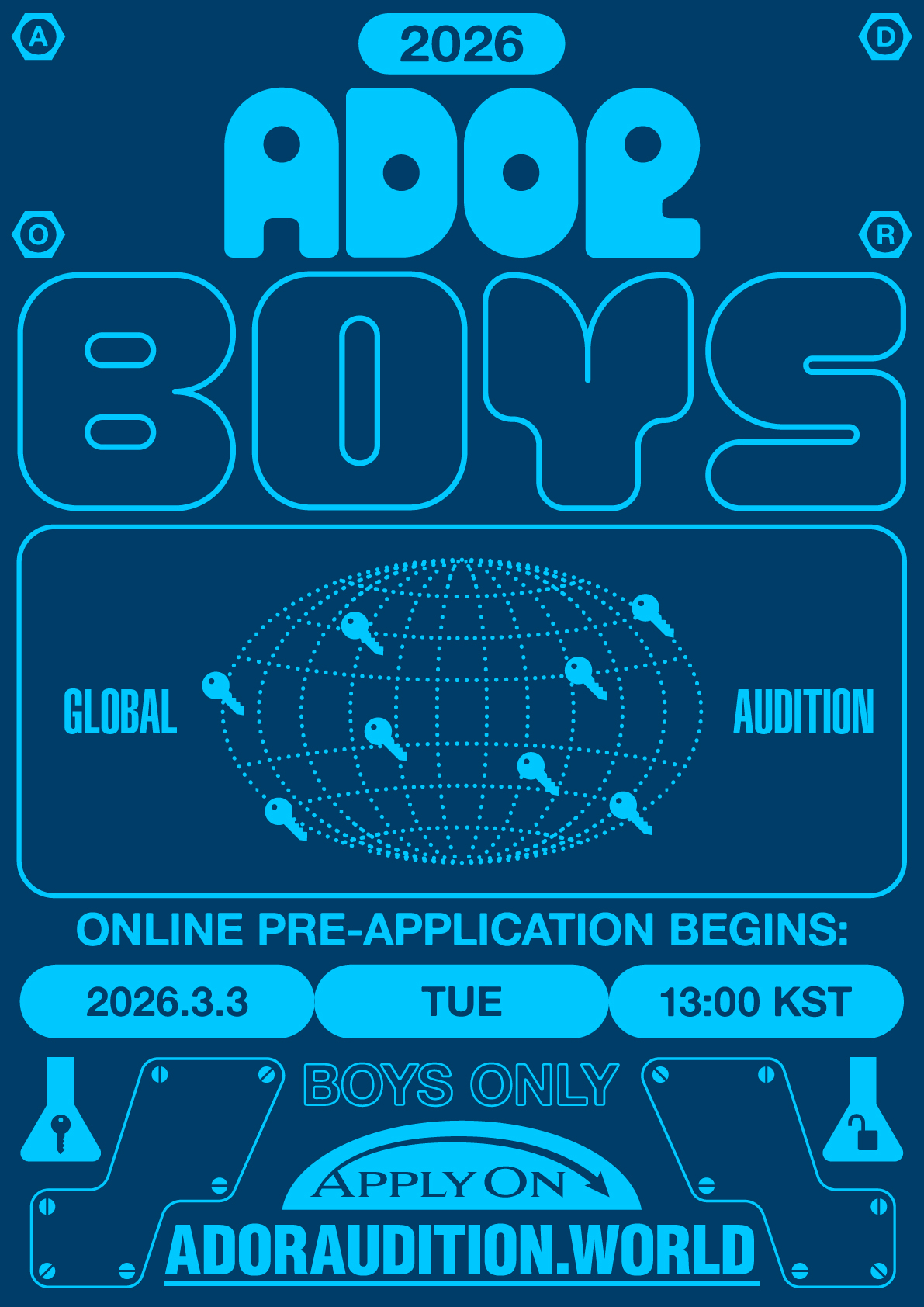 "2026 ADOR BOYS GLOBAL AUDITION" доступен для мужчин, родившихся в 2007 году. Нет никаких ограничений в области поддержки. Если у вас есть контент, который может показать вам свои преимущества: песня, танец, рэп, актерское мастерство, написание песен, написание песен, блог, фотографии и т.д.