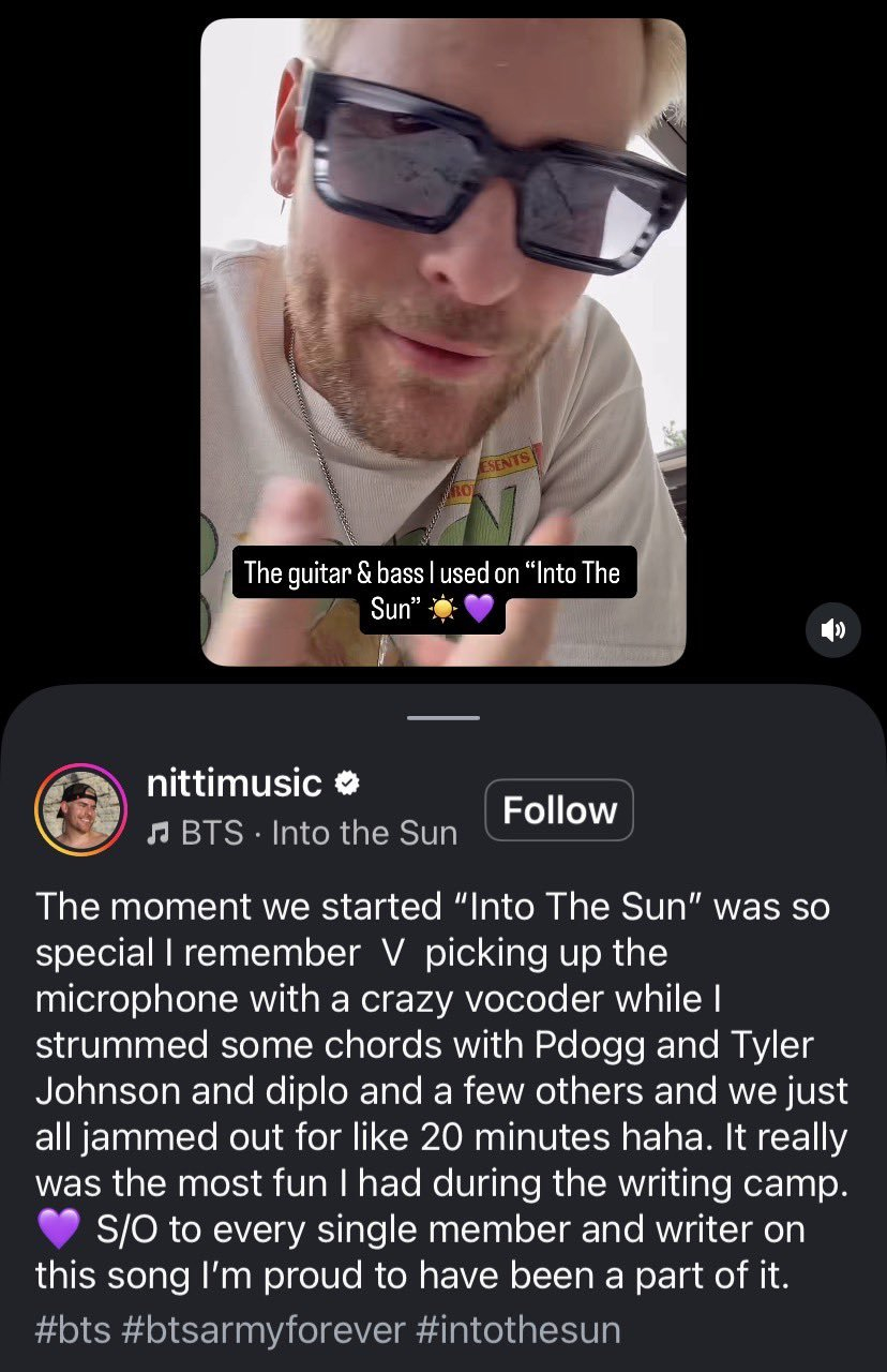 Момент, когда Нитти, продюсер, работавший над альбомом "Arirang", также начал "Into the Sun", был действительно особенным. Я помню время, когда Ви взял микрофон и использовал Crazy Bocoder (это своего рода электронные музыкальные инструменты и идеал как сочетание голоса и кодека). Piddog, Tyler Johnson, Diplo и несколько других участников группы играли в течение 20 минут. Это был самый весёлый момент в лагере для композиторов. Я очень горжусь тем, что могу быть частью этой песни", - сказал он, выразив удовлетворение работой Into the Sun.