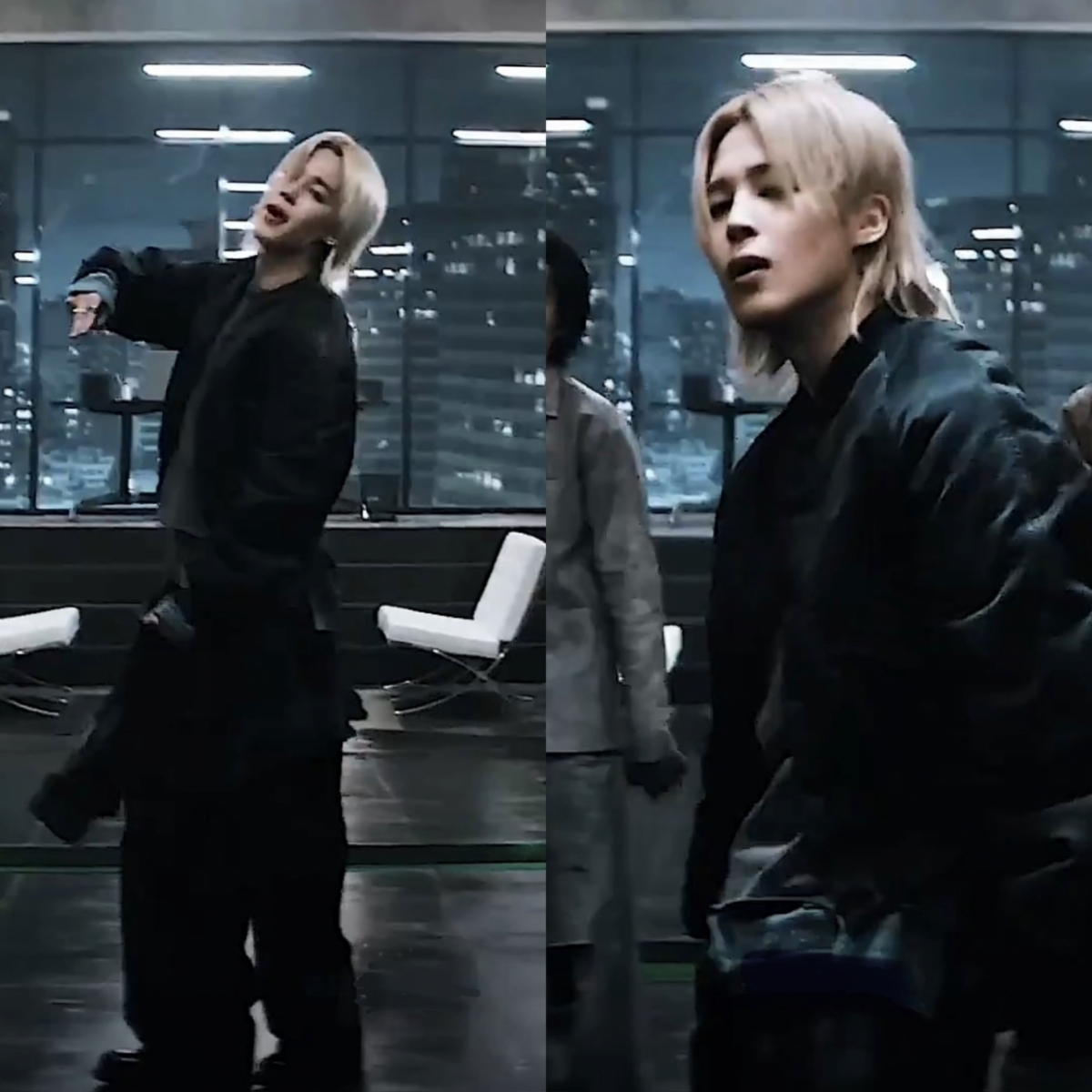 Когда сцена переключилась, развернулась инверсия. Он сразу же привлекает внимание нуарной атмосферой, надев костюм, который раскрывает тонкие линии тела Чимина на длинных ногах, спускающихся вниз по костылю.