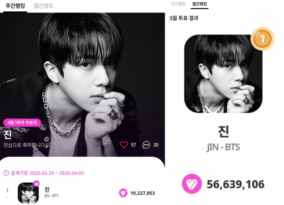 Джин достиг рекордного результата 110 недель подряд, заняв первое место в еженедельном рейтинге My One Pick K-POP на первой неделе апреля (29 марта - 5 апреля), заняв первое место. Подавляющее большинство голосов и непрекращающиеся рекорды позволили почувствовать неизменную поддержку и огневую мощь болельщиков по всему миру.
