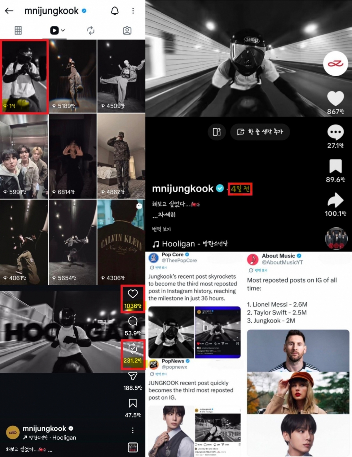 Видео Чонгука о Holygan Challenge собрало более 2 миллионов репостов за два дня. На третьем месте в истории Instagram по количеству публикаций (репостов), на первом месте - Лионель Месси с 2,6 миллионами, на втором - Тейлор Свифт с 2,5 миллионами.