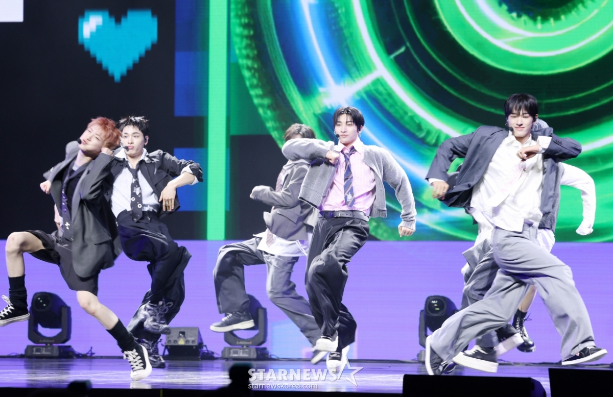 Группа Nexge выступает на витрине, посвященной выпуску своего второго сингла «Mchk (Mtzk)», который состоялся в Blue Square в Йонсан-гу, Сеул, 27-го числа. /2026.04.27