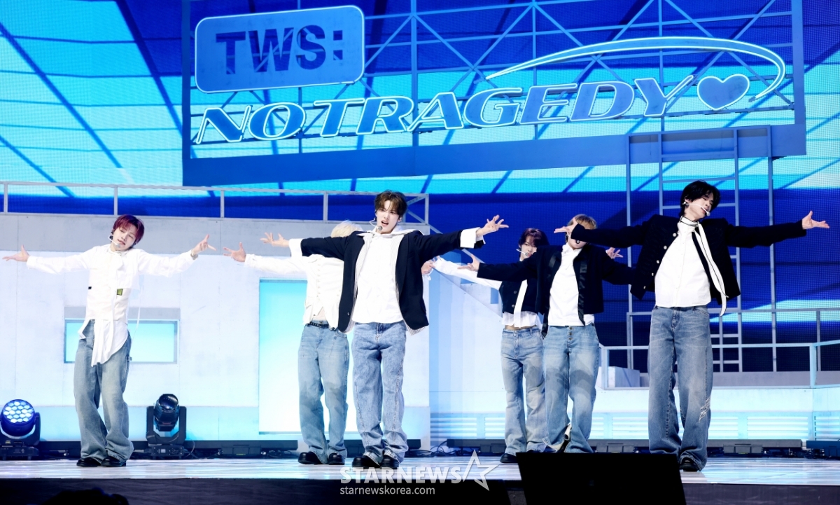 Группа Tours позирует на витрине, посвященной выпуску пятого мини-альбома "NO TRAGEDY", который состоялся в концертном зале Yes24 в Кванджин-гу, Сеул, 27-го числа. /2026.04.27