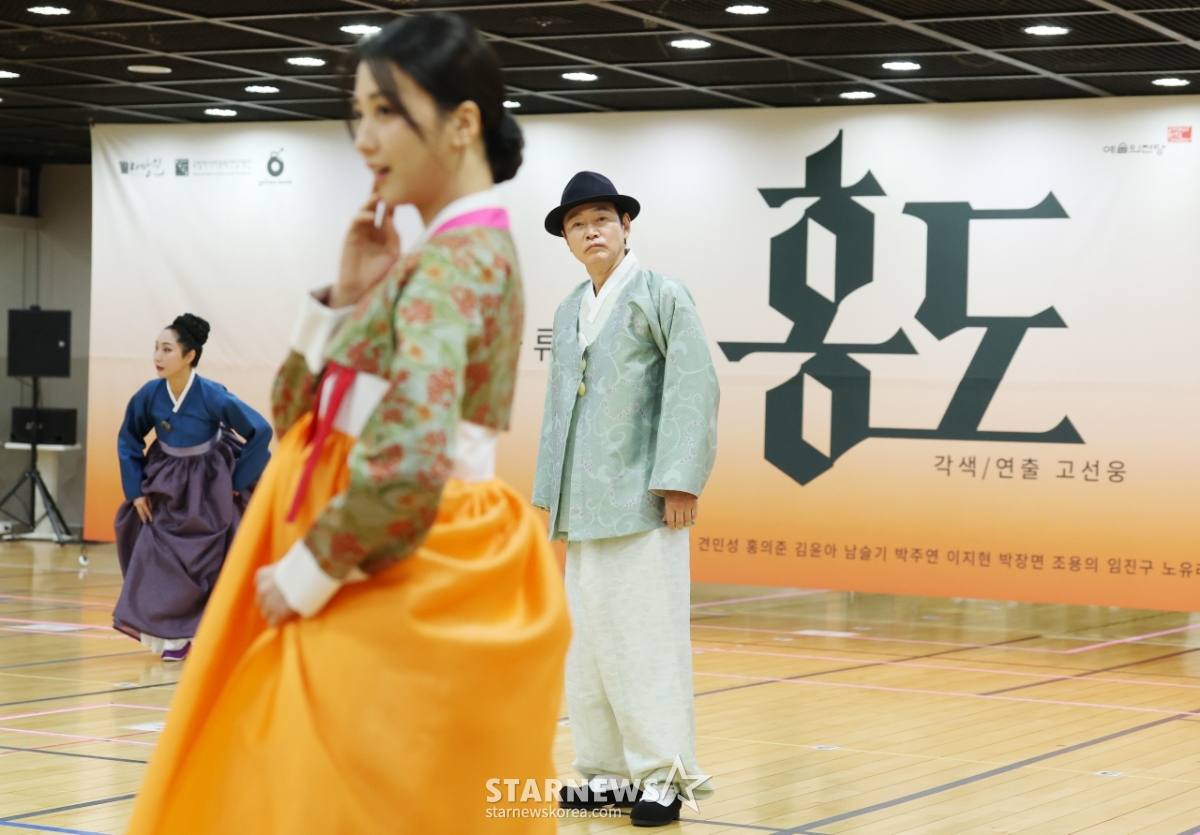 Актёры Пак Ха Сон и Ин Сок представляют прекрасное представление перед презентацией спектакля «Хондо», который состоялся 1-го числа в тренировочной комнате женского университета Соншин Ми Унчжон Грин Кампус Мару в Кангбук-гу, Сеул. /2026.04.01