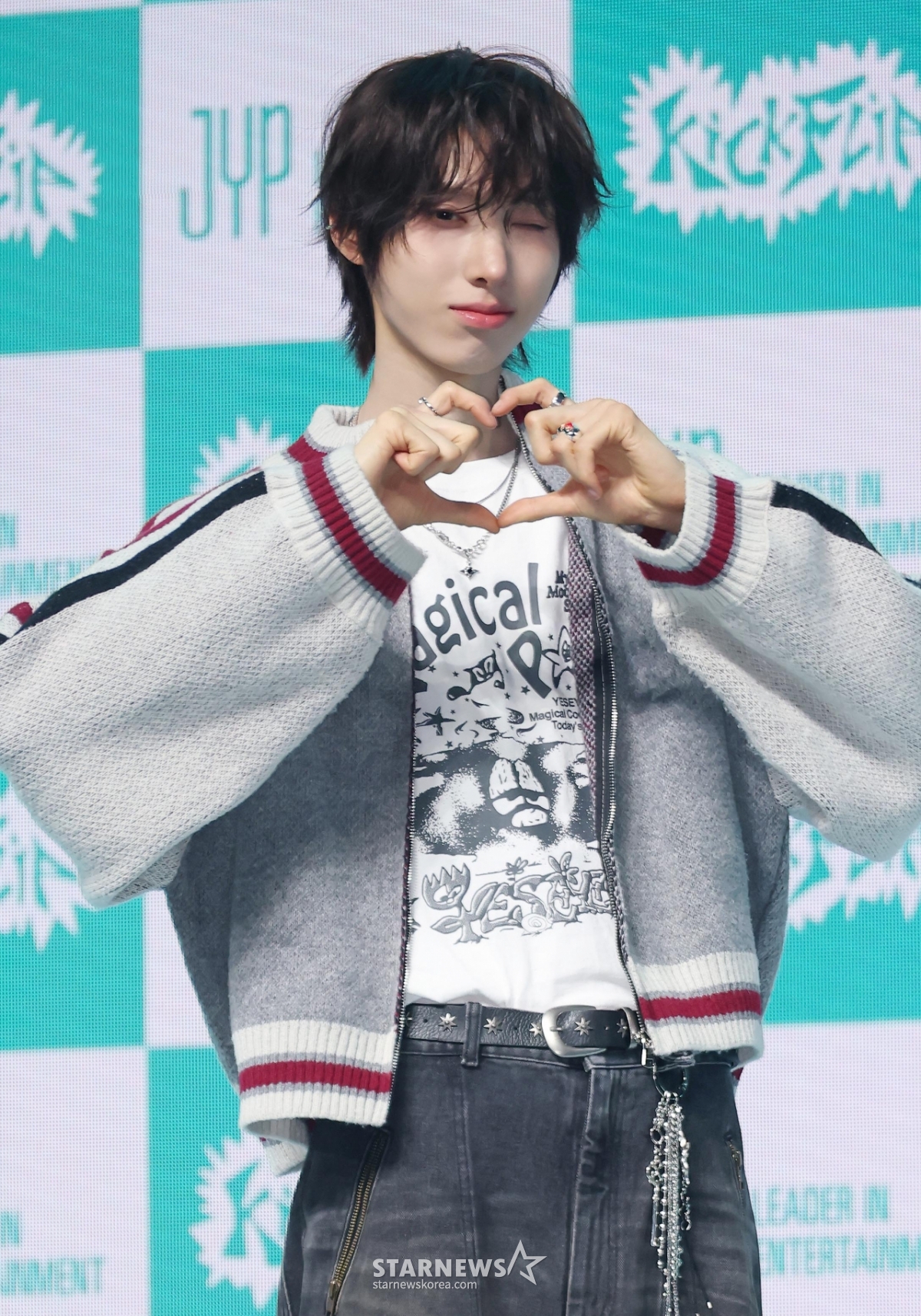 Группа Kick Flip позирует на шоукейсе в честь выхода своего четвертого мини-альбома "My First Kick" (My First Kick) в концертном зале Yes24 в Кванджин-гу, Сеул, во второй половине дня 6-го числа.