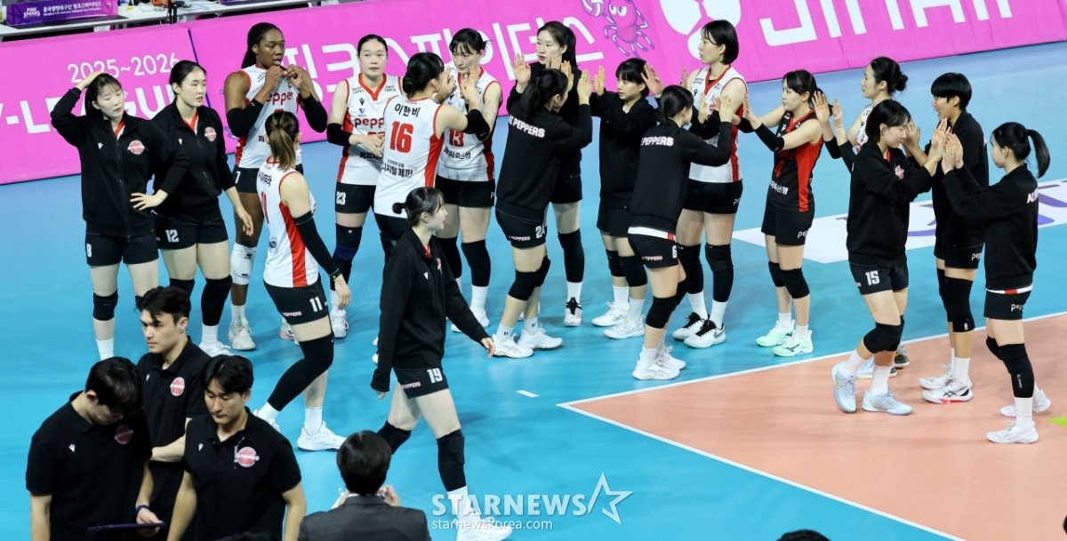 Игроки Pepper Savings Bank завершают игру после поражения в матче V-лиги Hungkuk Life и Pepper Savings Bank на стадионе Самсан World 2-го числа. 2026.02.01.