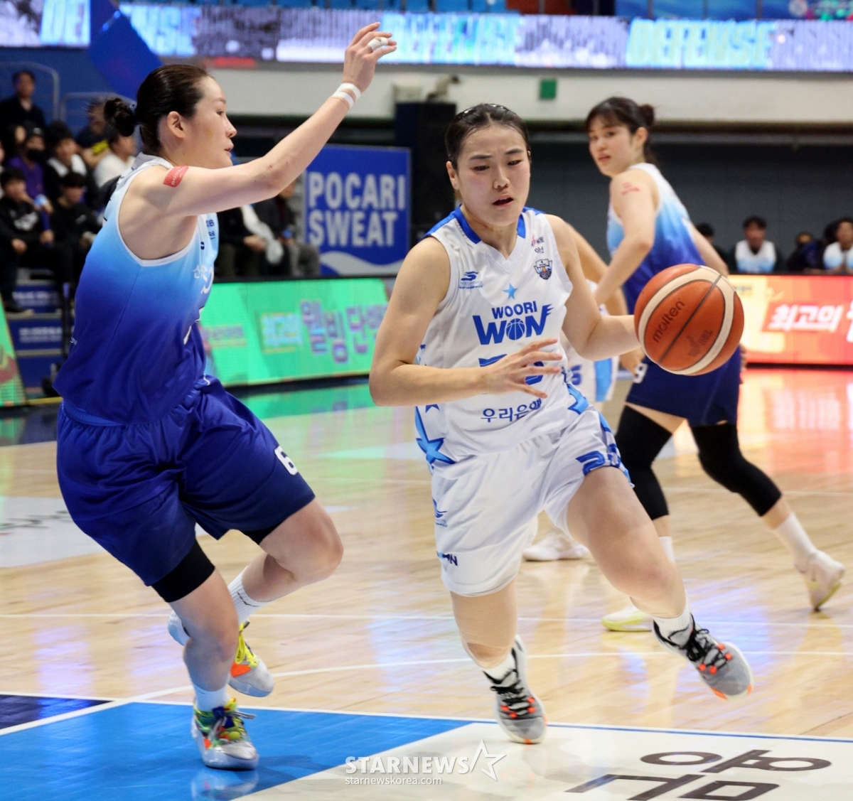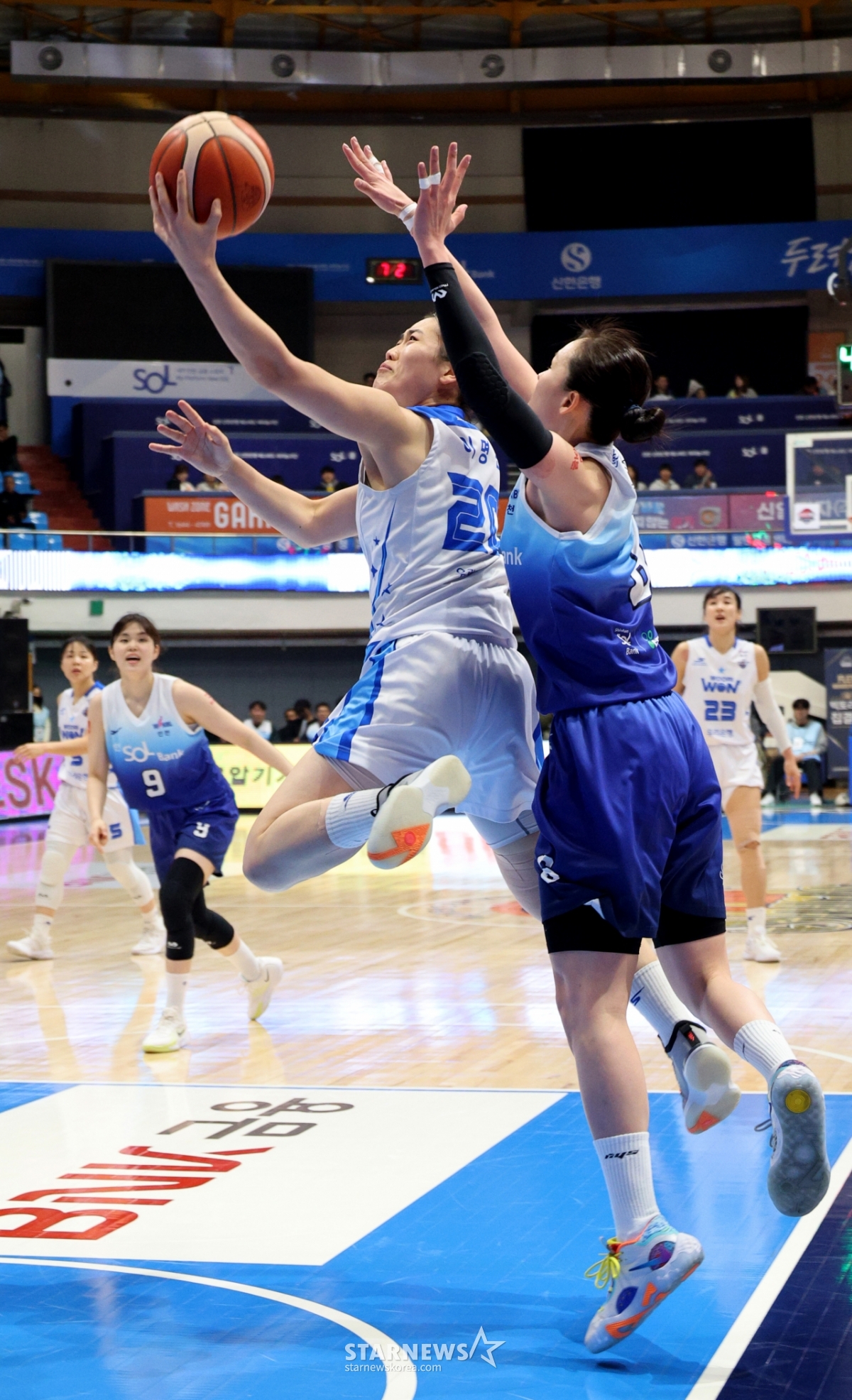 Наш Ли Мён Гван пытается сделать быстрый выстрел, обогнав Хон Ю Сун в матче с Shinhan Bank 2025-2026 WKBL, который прошел в гимназии Dowon в Инчхоне 11-го числа. 2026.02.11.