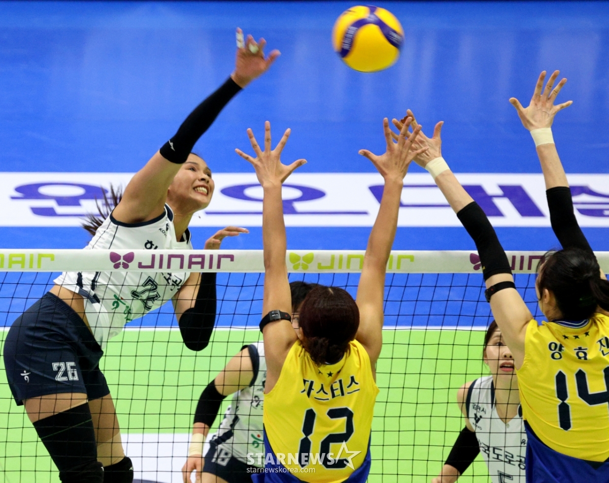 Дороти Танача наносит удар по Hyundai Double Blocking в матче между Hyundai E&C 2025-2026 Jin Air V League и Корейской дорожной корпорацией, который состоялся в Сувон гимназии 13-го числа. 2026.02.13.