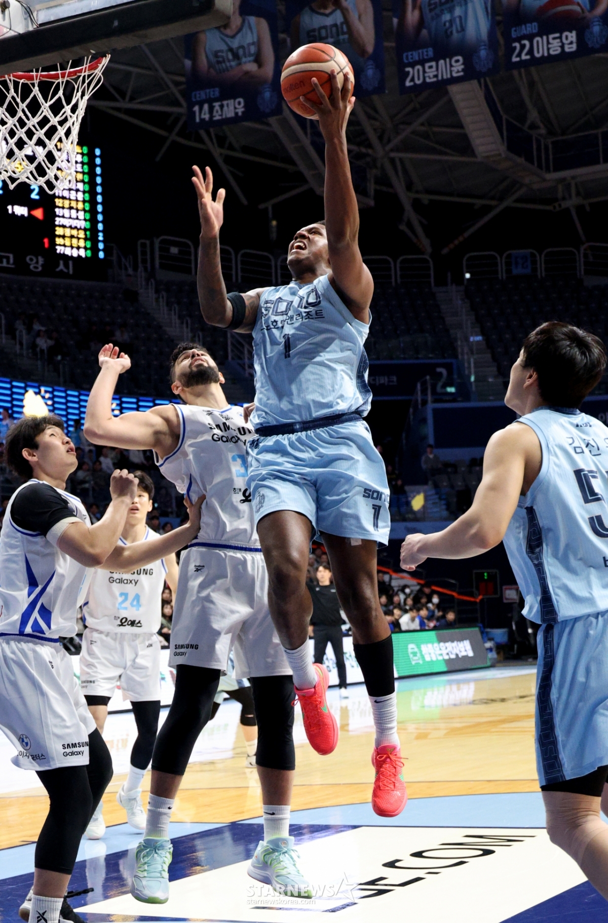 Коян Соно Найт пытается сделать ра-ап выстрел в матче между профессиональным баскетболистом LG Electronics Коян Соно 2025-2026 годов и Самсунг Сеул, который состоялся на Соно Арене Коян 19-го числа. 2026.02.19.