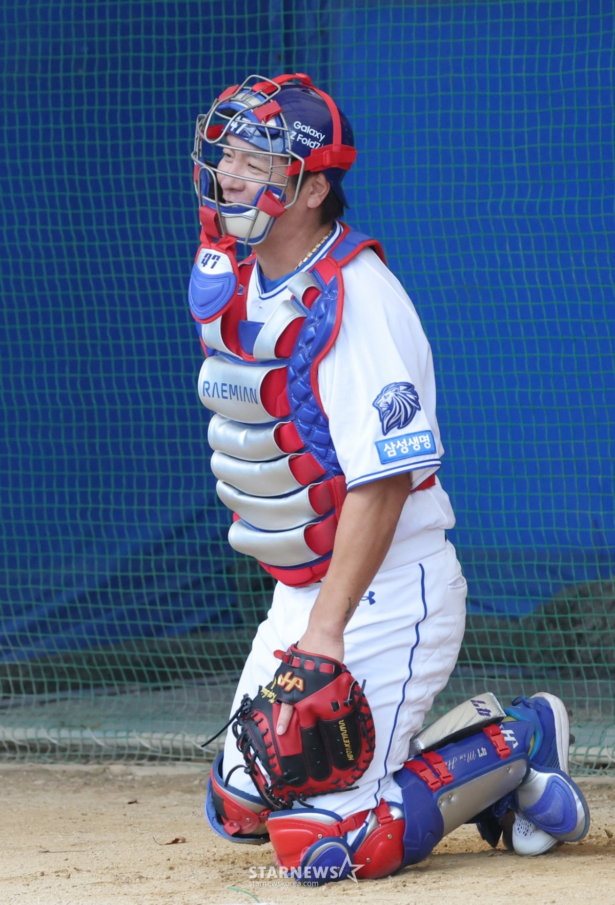 Кан Мин Хо кричит "Вперед", получая питчинг от юниоров в КПЗ.