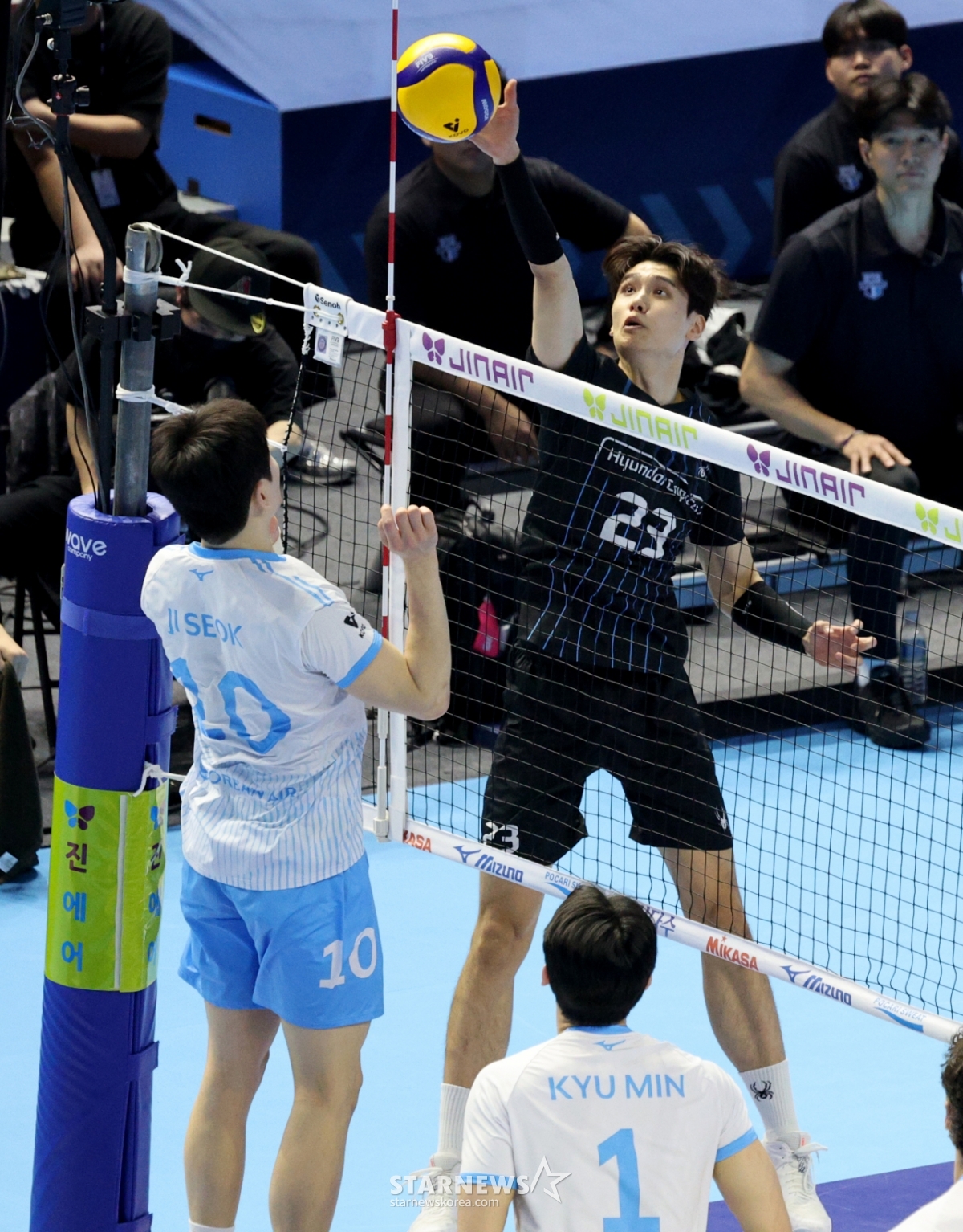 Hyundai Ли Сын Джун пытается ударить подряд в игре Hyundai Capital против Korean Air 2025-2026V League, которая состоялась в Gyeyang Gymnasium 22-го числа. 2026.02.202.
