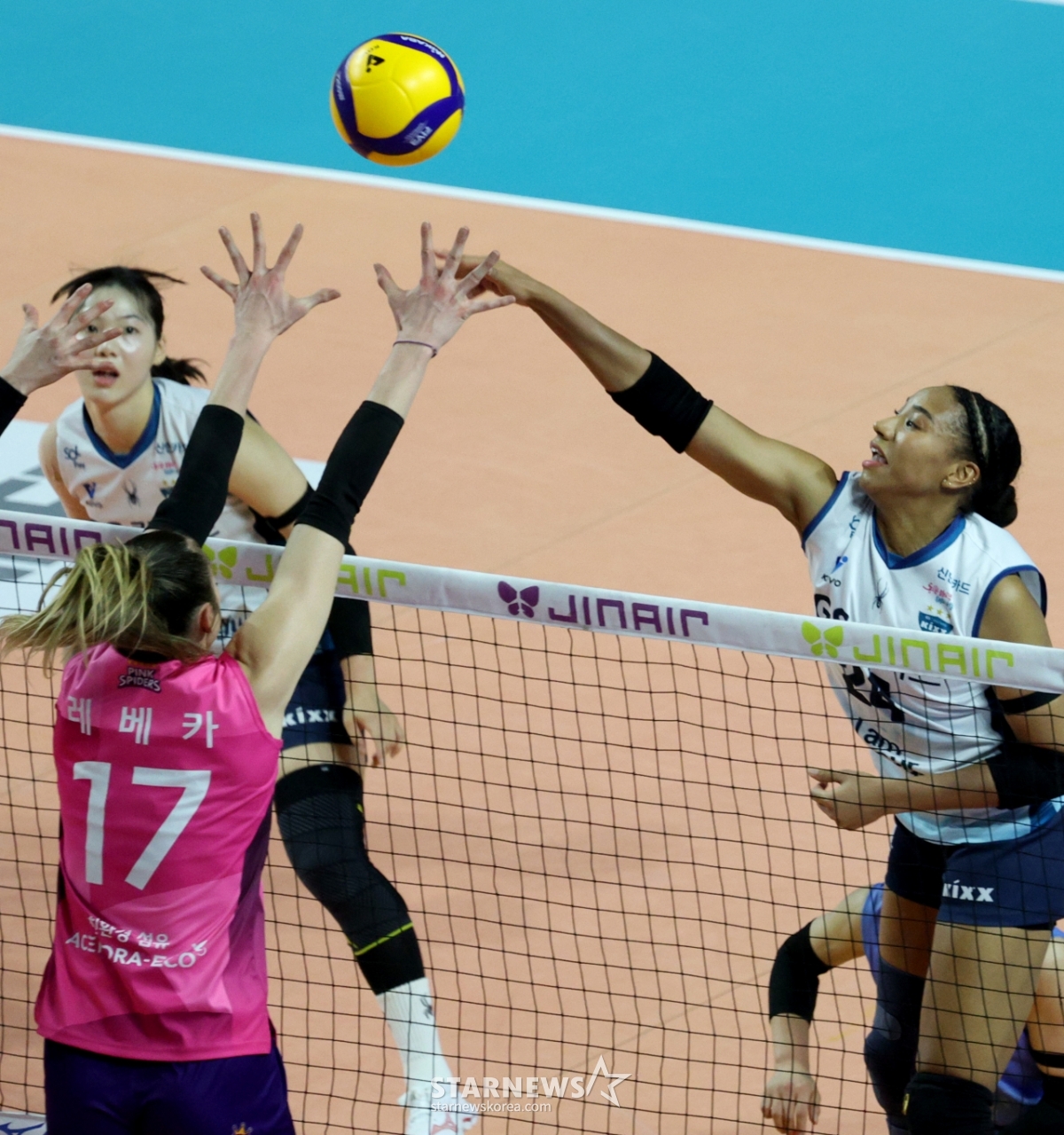 GS Raina ударит по игре GS Caltex с женской командой Jin Air 2025-2026 V League Hungkuk Life, которая состоялась 27-го числа на стадионе Самсан World.2026.02.27.