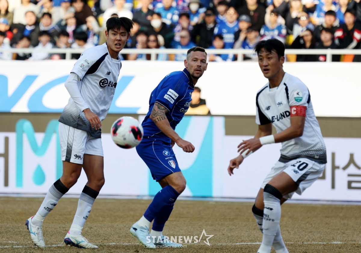 Сувон Самсунг Ильюченко помогает Пак Хён Бину сравнять счет в матче против банка 2026 Хана К-Лига 2 Сувон Самсунг, который состоялся на стадионе Кубка мира Сувон 28-го числа. 2026.02.28.