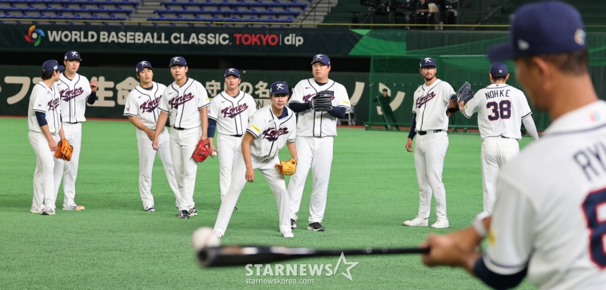 Питчер национальной бейсбольной команды Ю Ён Чан тренируется по защите питчеров на официальной тренировке Tokyo Dome 4-го числа, за день до открытия раунда 2026 WBC в Токио. 2026.03.04.