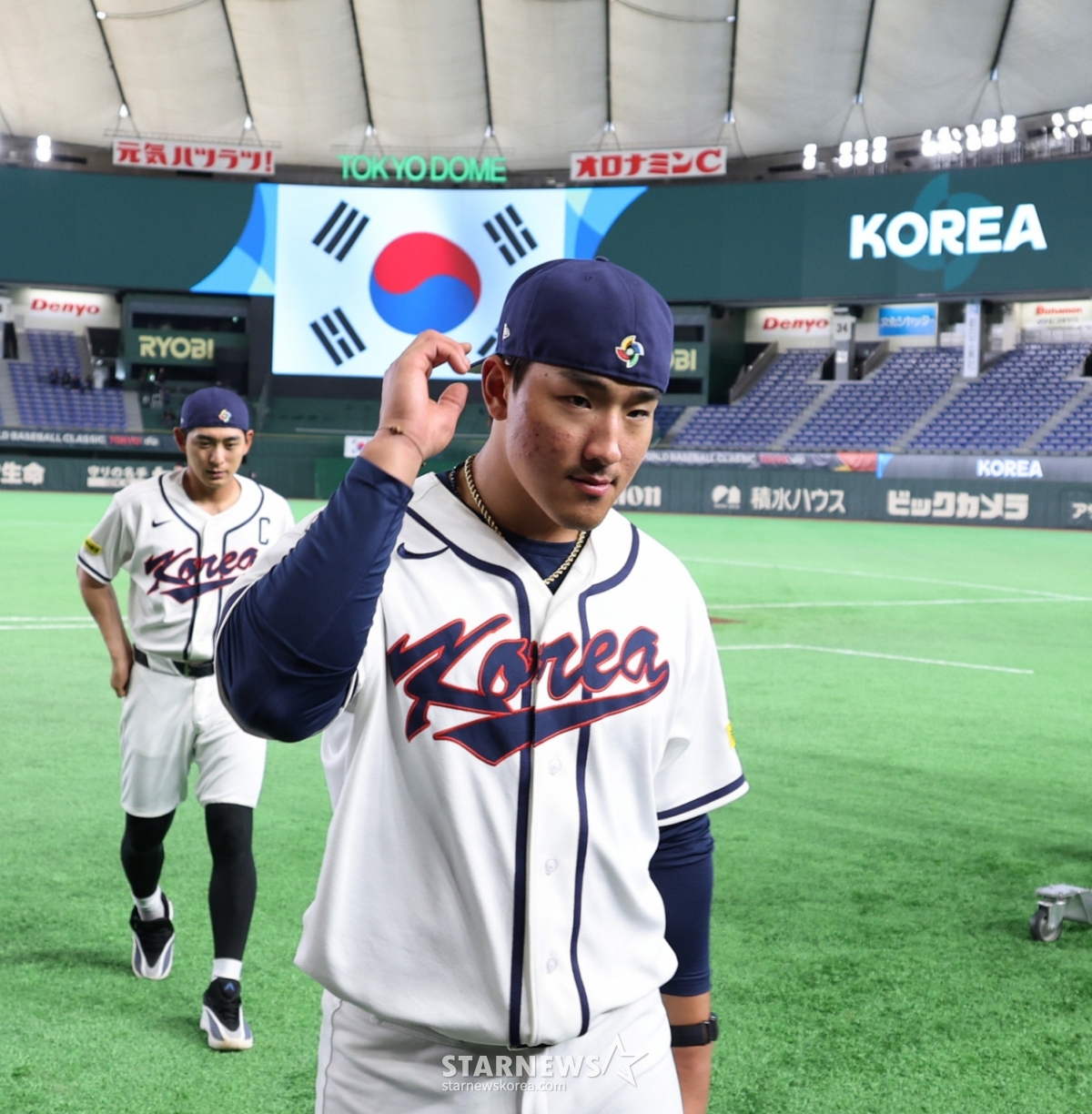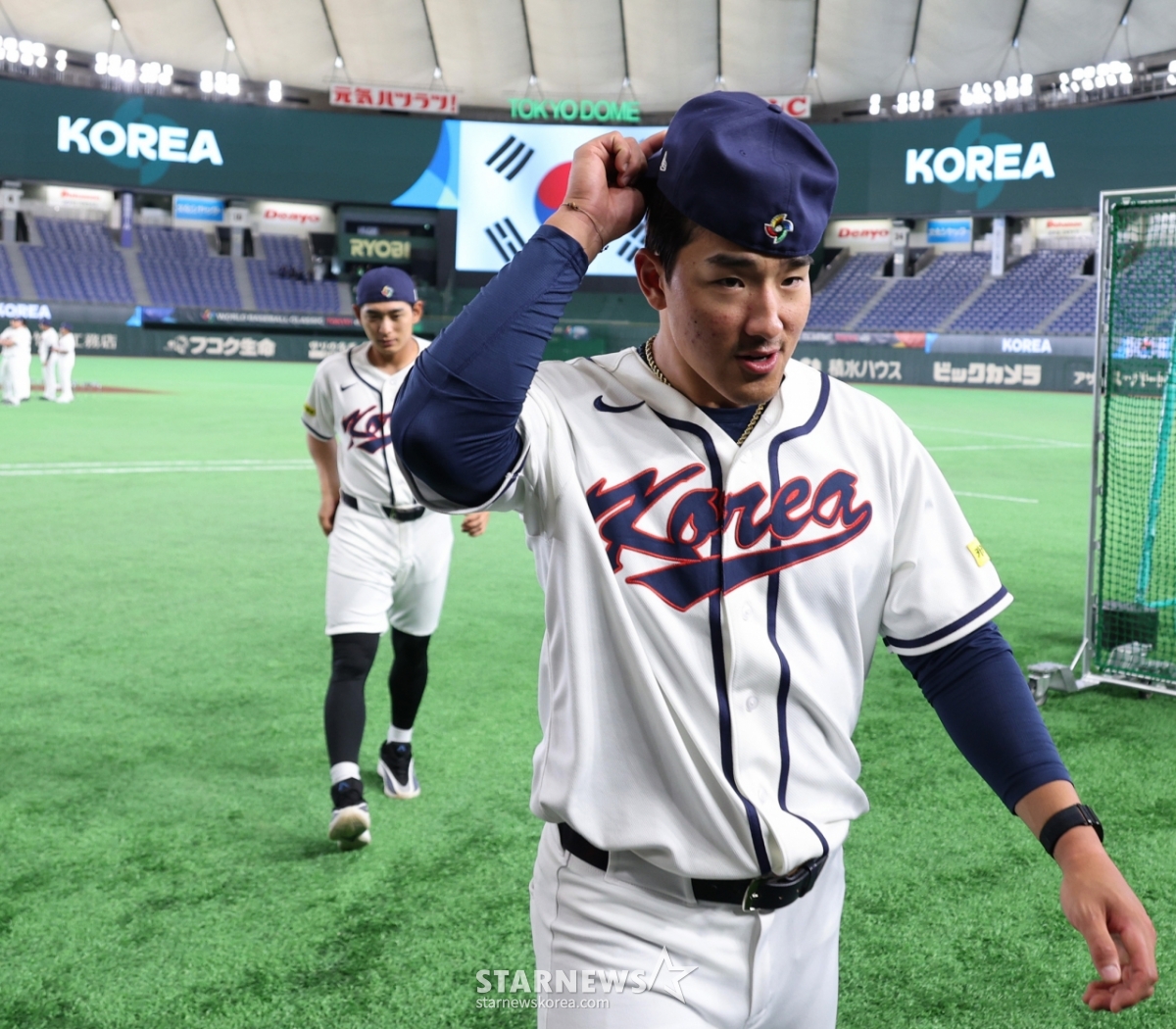 Бейсбольные команды Ан Хён Мин и Ли Чжон Ху покидают поле после официальной тренировки Tokyo Dome 4-го числа, за день до открытия Tokyo Round 2026 WBC. 2026.03.04.
