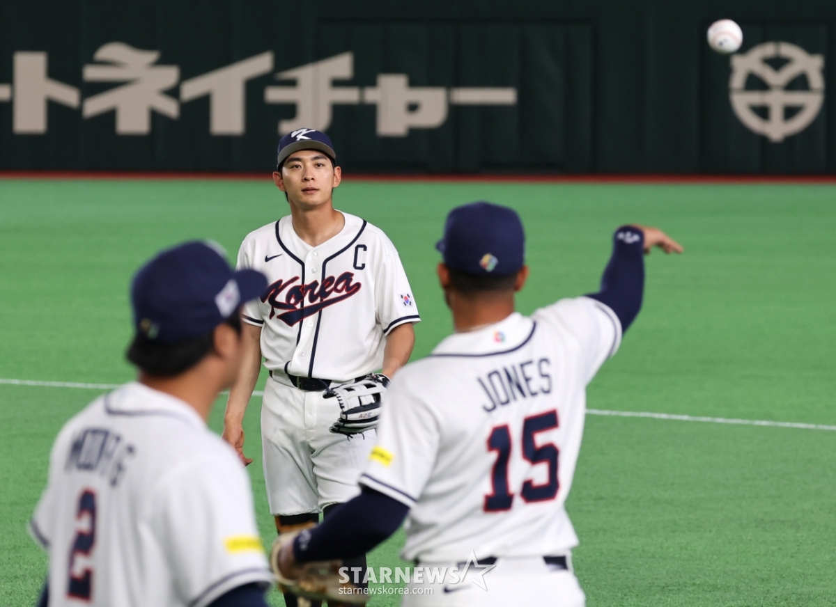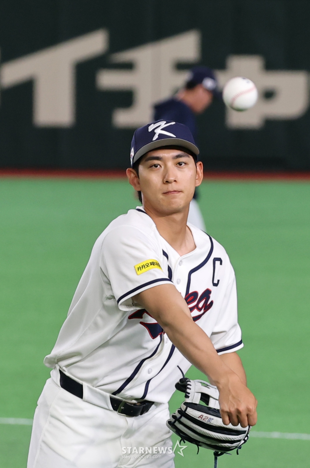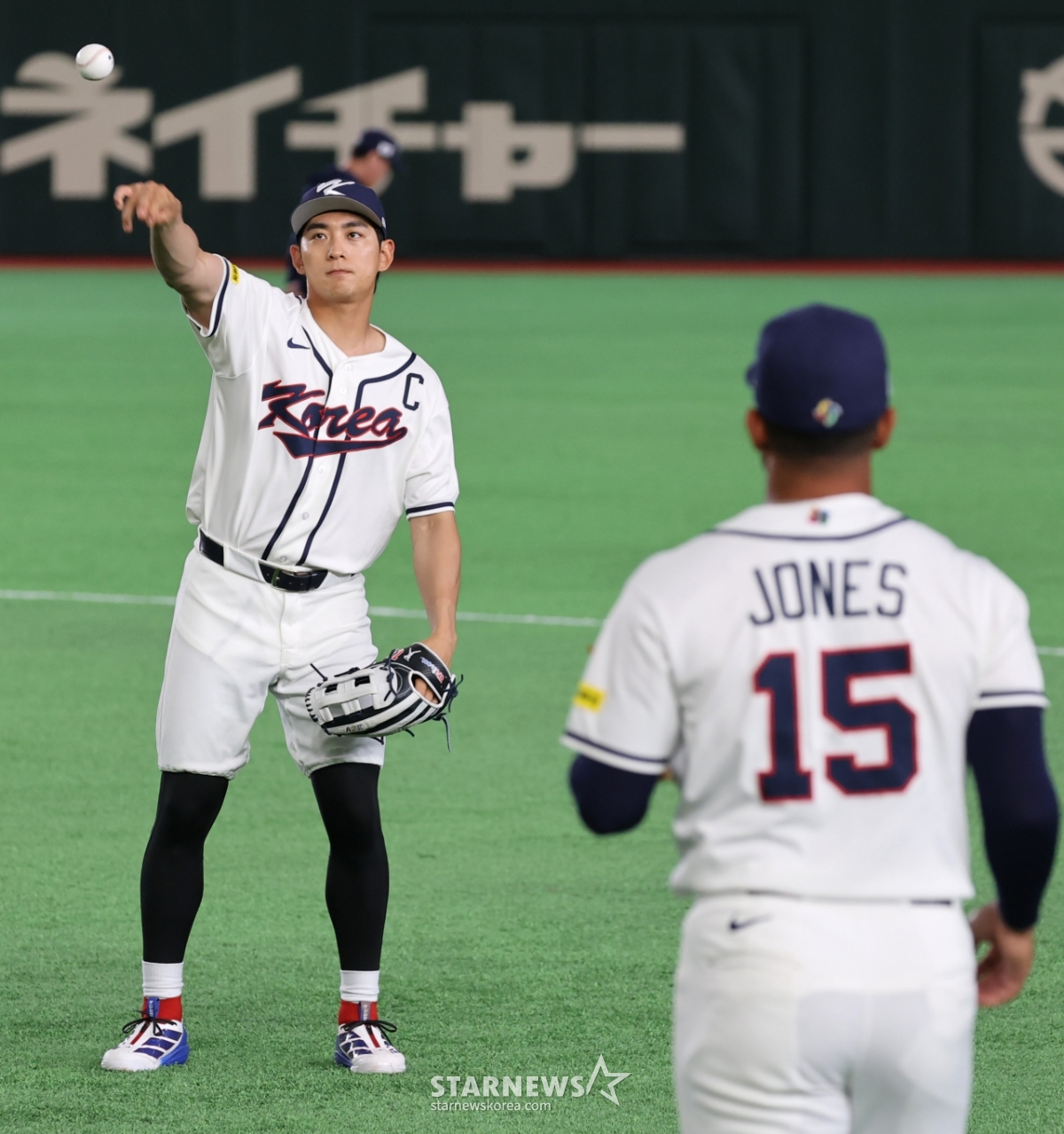 Бейсбольная команда Ли Чжон Ху играет в ловушку с Джонсом на официальной тренировке Tokyo Dome 4-го числа, за день до открытия Tokyo Round 2026 WBC. 2026.03.04.