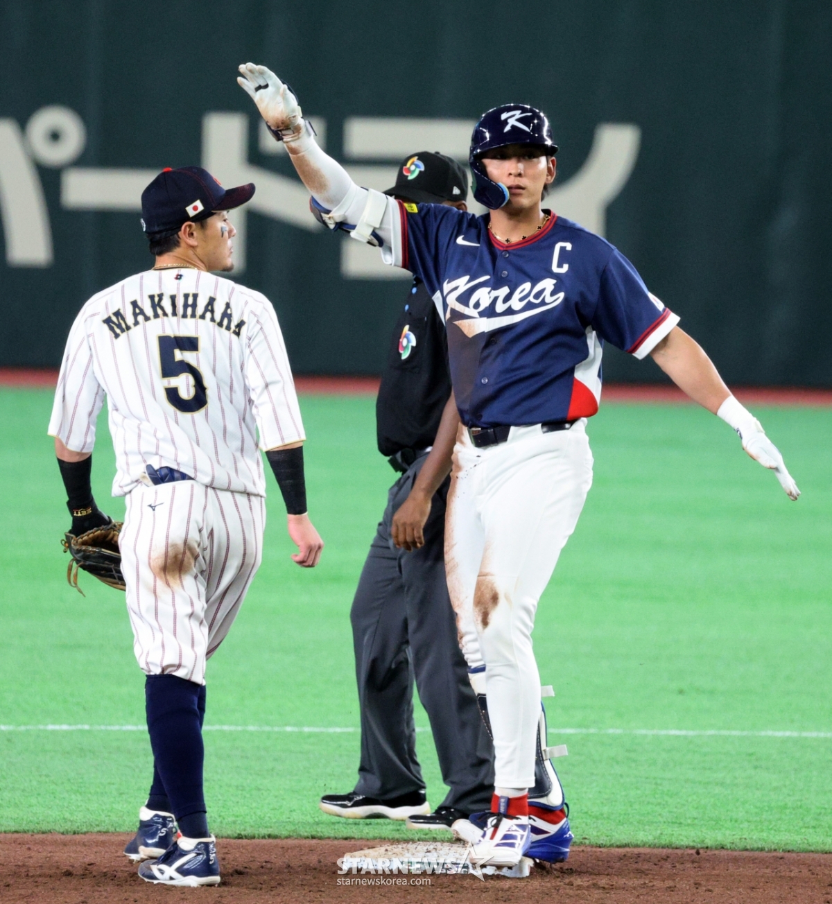 Ли Чон Ху, третий нападающий в Корее, выступает в качестве ведущего нападающего в начале восьмого иннинга 2026 WBC Tokyo POOL против Южной Кореи в Токио Доме 7-го числа и прыгает на вторую базу, делая двойной. 2026.03.07.