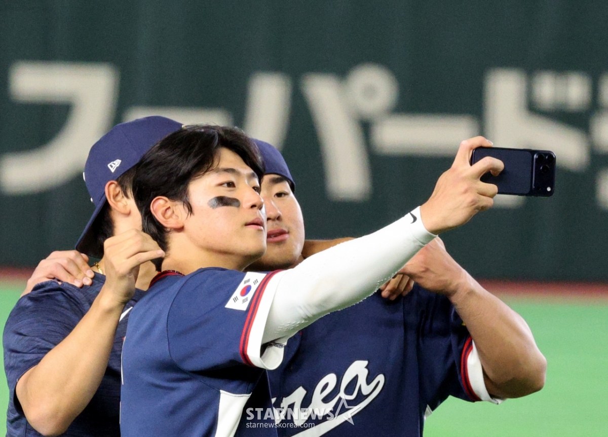 Корейская бейсбольная команда подтвердила поездку в Майами, выиграв матч 2026 WBC Tokyo POOL против Южной Кореи и Австралии со счетом 7:2, состоявшийся 9-го числа в Tokyo Dome. Это была жуткая игра, в которой осталось 2 пробежки с разницей в 5 очков. Ким До Ён и Ан Хён Мин делают селфи. 026.03.08.