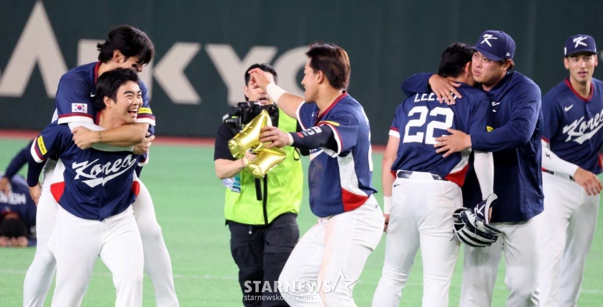 Рю Хён Джин обнимает тренера Ли Джин Хёна. Рядом Мун Хён Бин разделяет радость, надевая Ким Доён.Корейская бейсбольная команда подтвердила поездку в Майами, выиграв матч 2026 WBC Tokyo POOL против Южной Кореи и Австралии со счетом 7:2, состоявшийся 9-го числа в Tokyo Dome. Это была жуткая игра, в которой осталось 2 пробежки с разницей в 5 очков. 026.03.08.