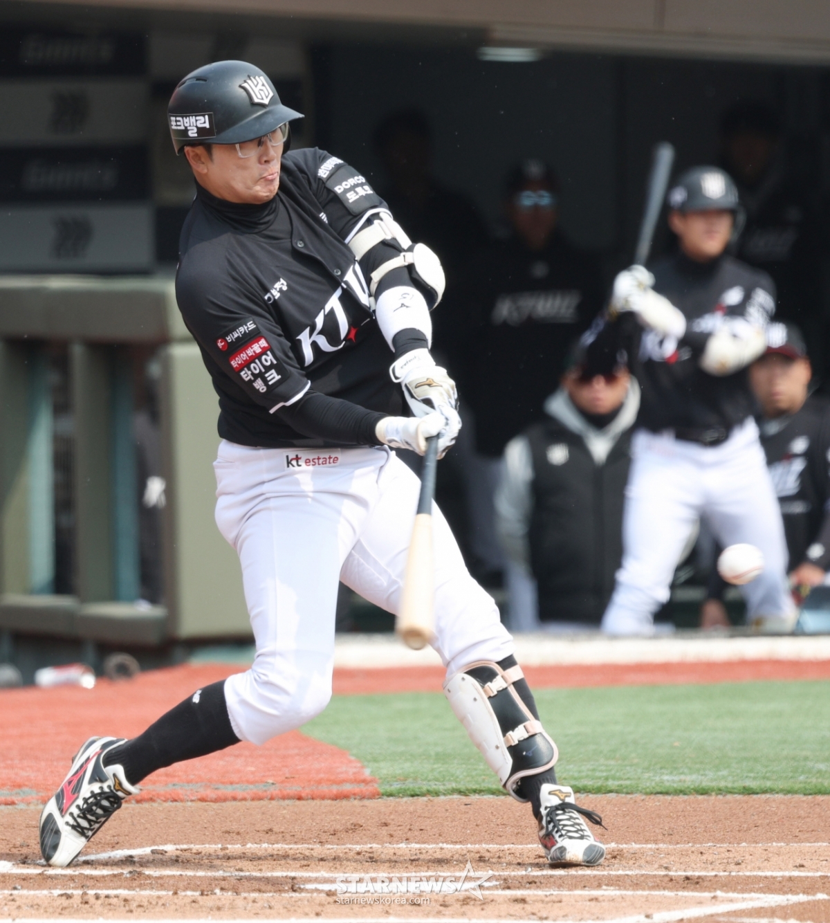 КТ Хо Кён Мин наносит веселый удар в начале первого иннинга.