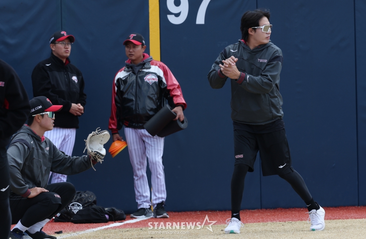 LG Лим Чан Гю играет роль нападающего в симуляционных тренировках питчинга для юниоров.