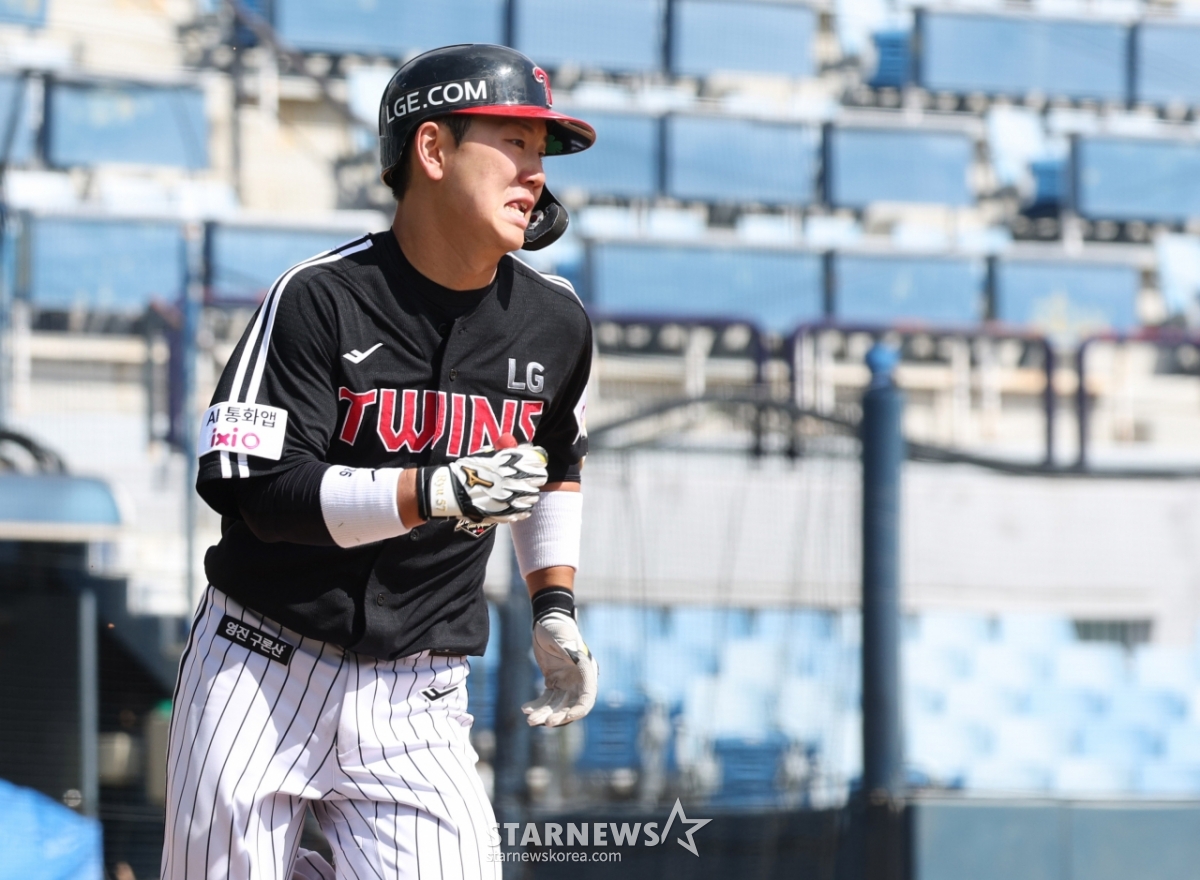 Ли Джу Хон из LG мчится с хоумраном в одно очко в ничью в начале третьего иннинга.
