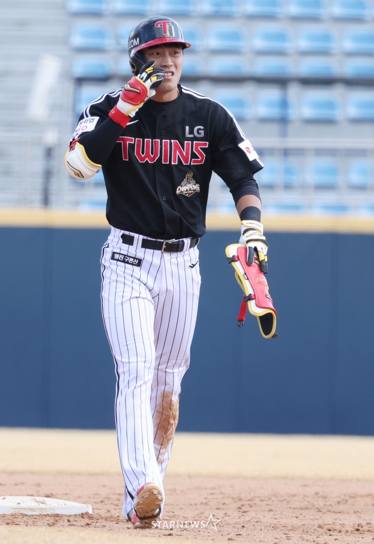 В начале седьмого иннинга LG Чон Сон Хо взлетает на базу с двумя очками и своевременным двойным ударом.