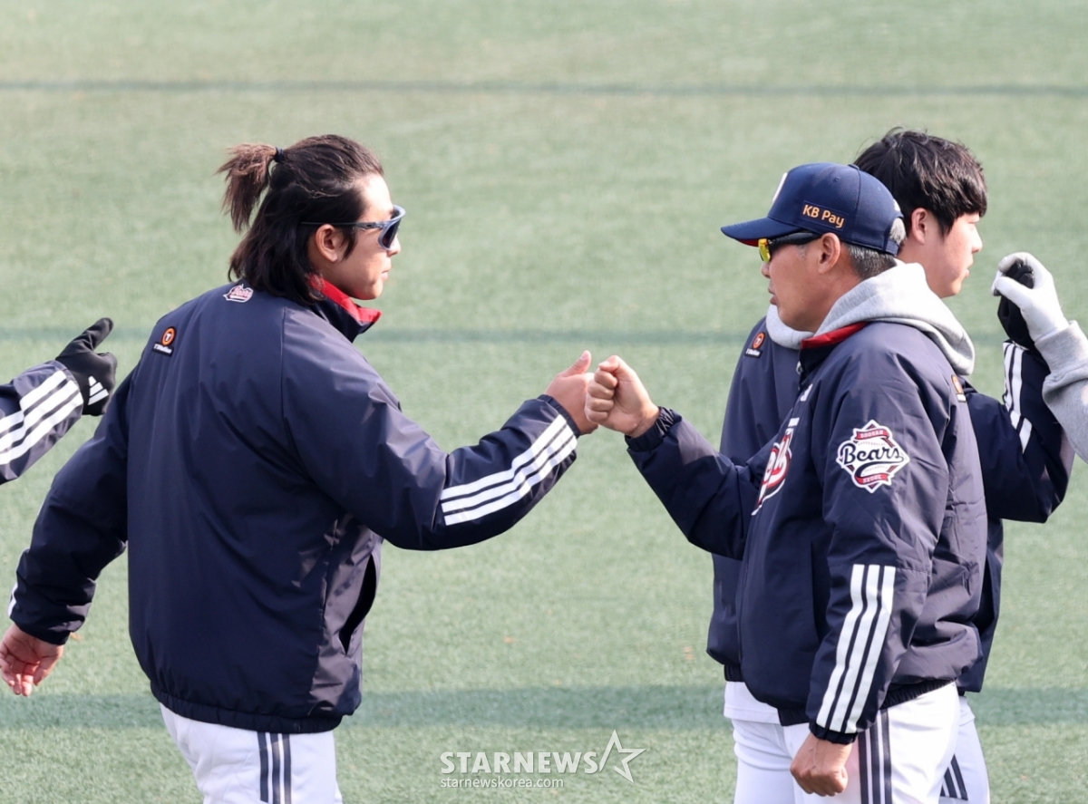 Тренер Дусан Ким Вон Хён Ким делит хайп с Пак Чан Хо после победы в демонстрационном бейсболе 2026 года с Doosan Bears в парке Doosan Bears в Ичхоне 15-го числа. 2026.03.15.