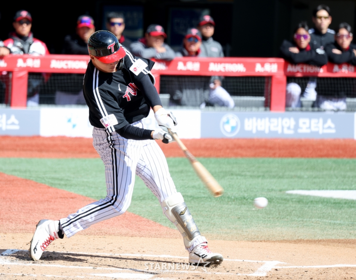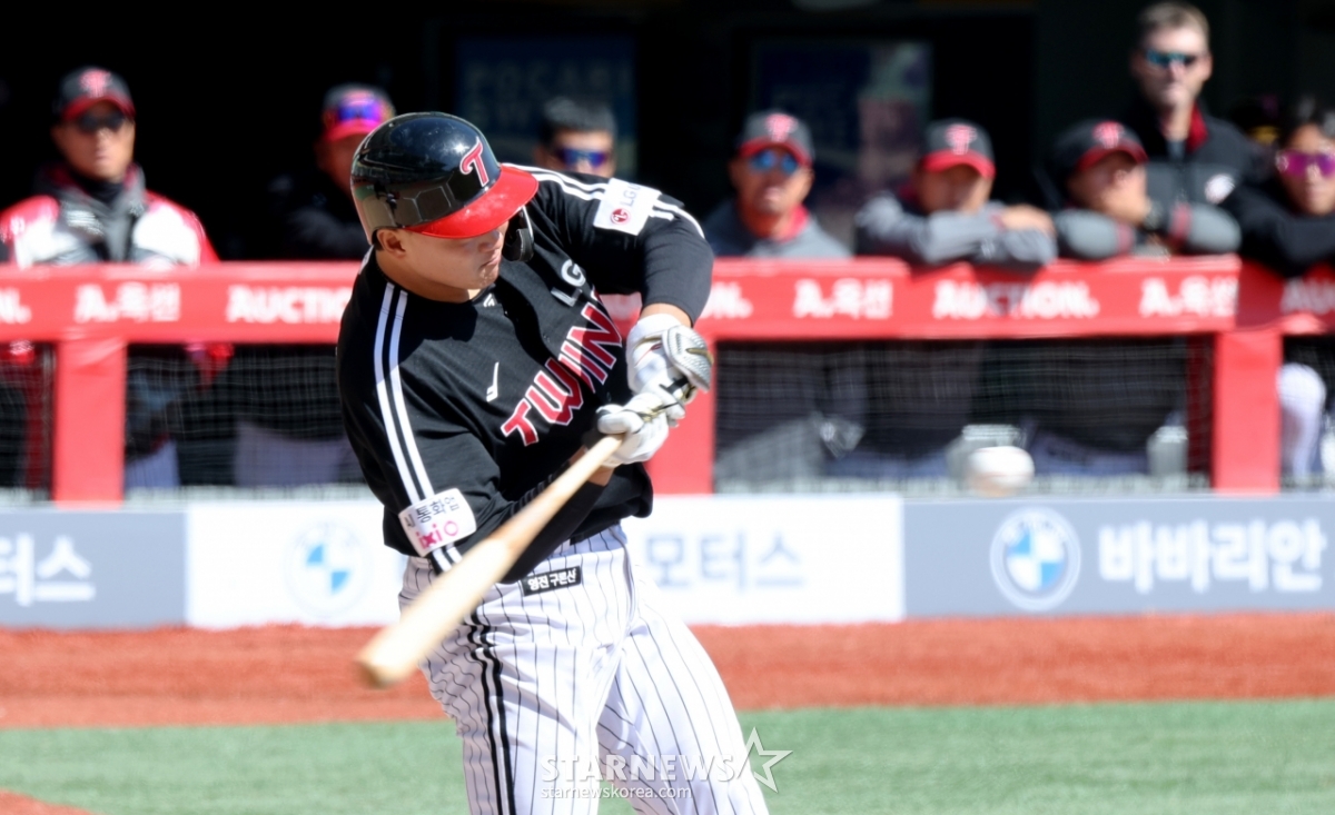 Ли Джэ Вон, нападающий LG 8, ударяет страйк-аутом в начале четвертого иннинга игры 2026 профессионального бейсбола «SSGlanders» и «LG Twins», который состоится на стадионе SSG Landers в Инчхоне 19-го числа. 2026.03.19.