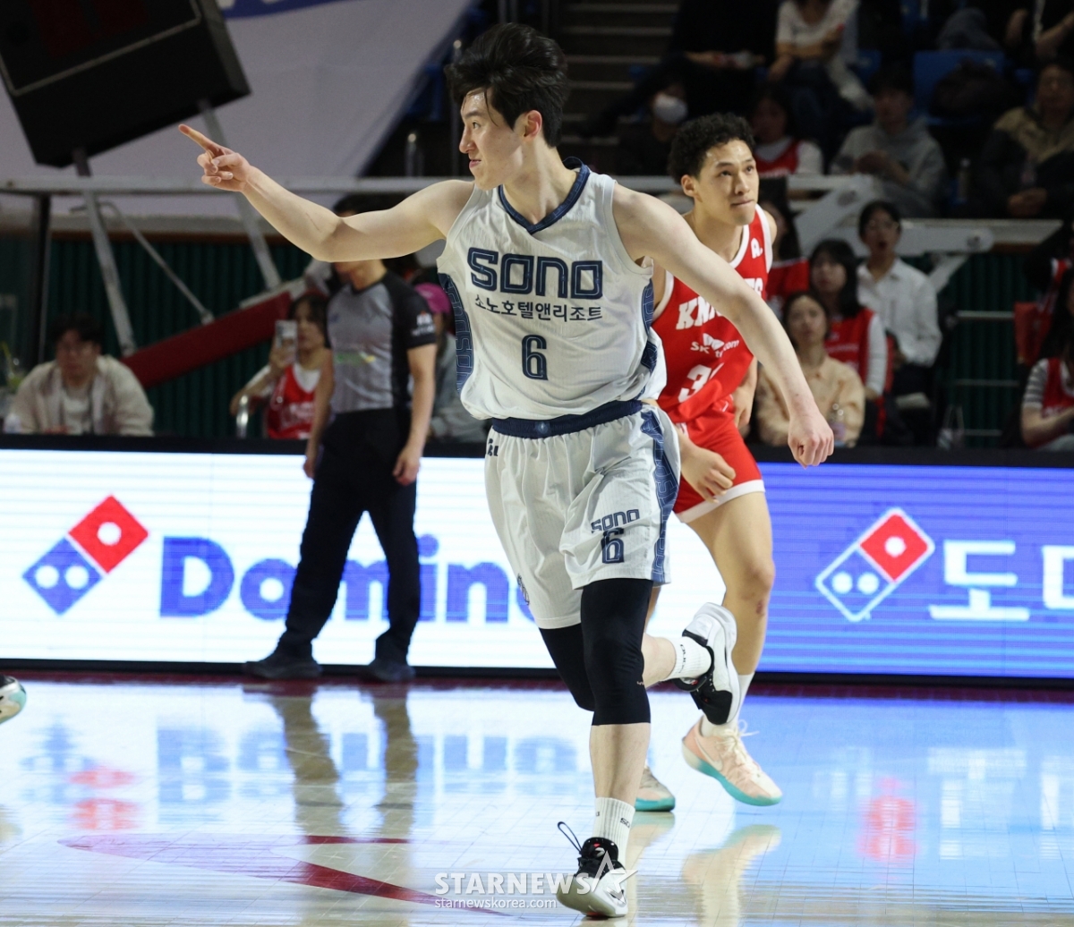 Ли Чжон Хён Соно играет на заднем пальто после успешного трехточечного броска, обойдя Эдди Дэниела из SK.
