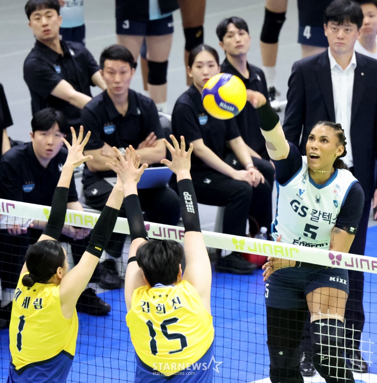 GS Silva ударит по Hyundai Double Blocking в плей-офф GS Keltex с 2025-2026 Jin Air V League, который состоялся в Сувонской гимназии 26-го числа. .2026.03.26.