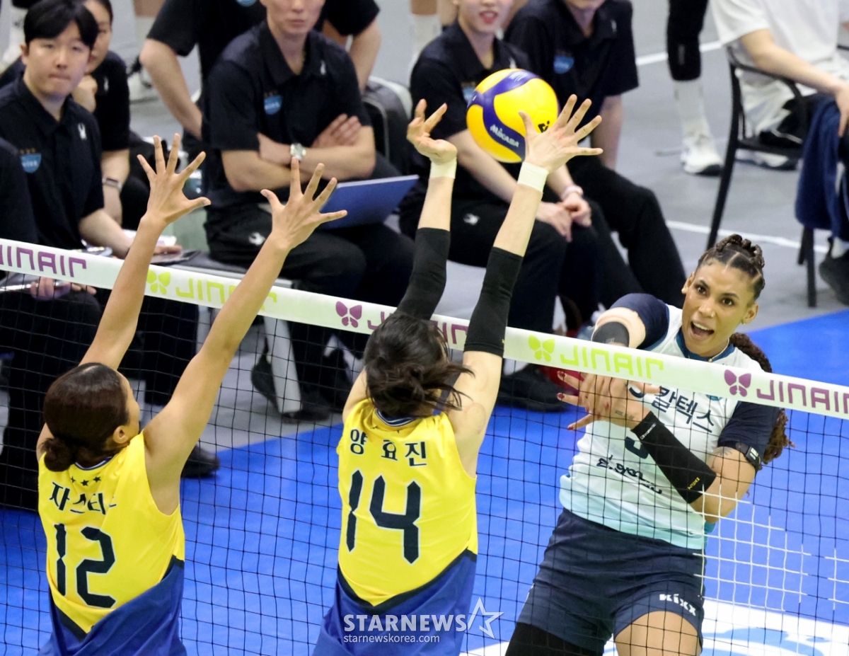 GS Silva ударит по двойному блоку Hyundai в матче плей-офф GS Keltex против Hyundai E&C 2025-2026 Jin Air V League, который состоялся в Сувонской гимназии 26-го числа. .2026.03.26.