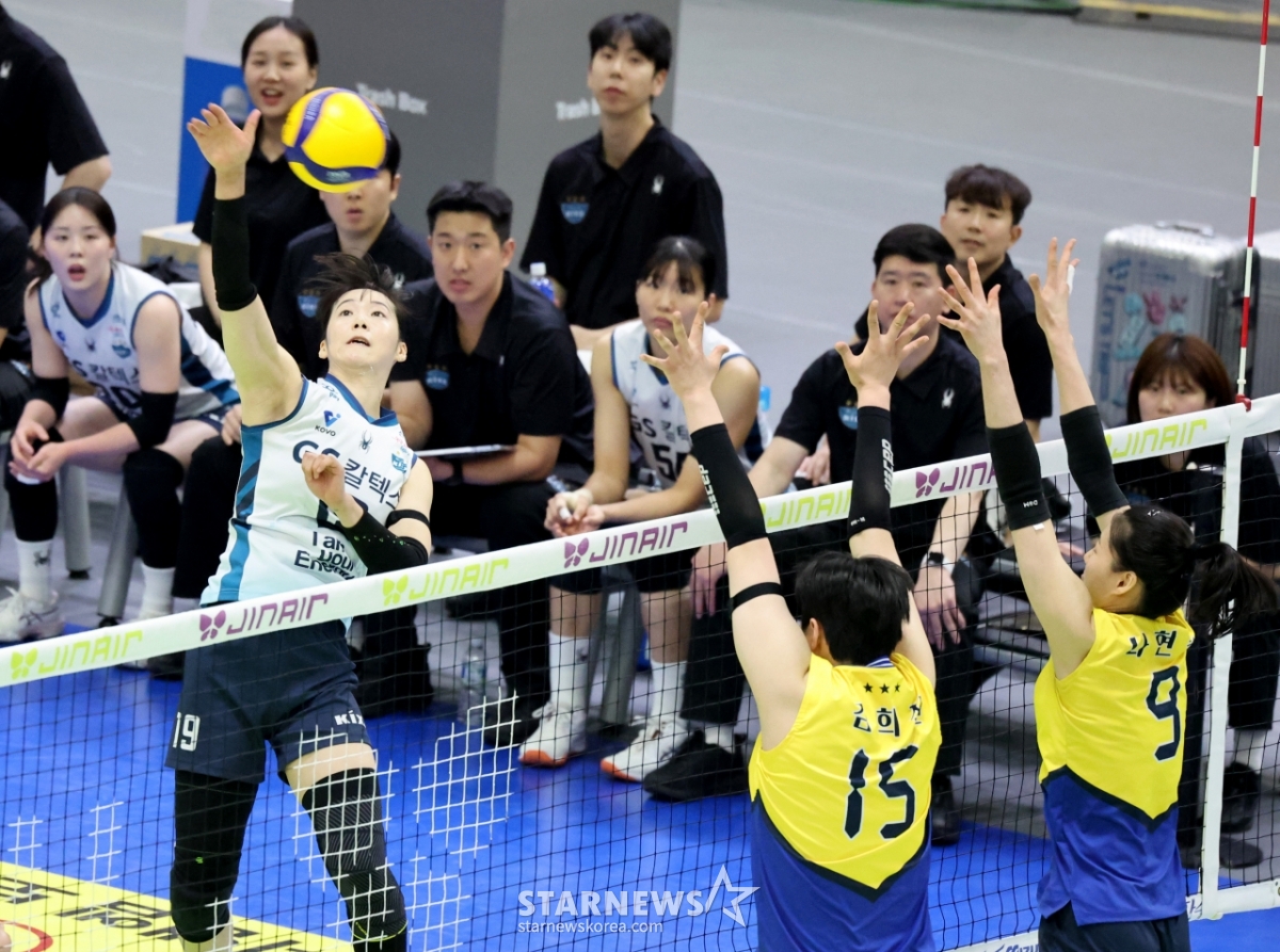 Со Су Ён из GS пытается ударить по Hyundai Double Blocking в плей-офф GS Keltex с 2025-2026 Jin Air V League, который состоялся в Сувонской гимназии 26-го числа. .2026.03.26.