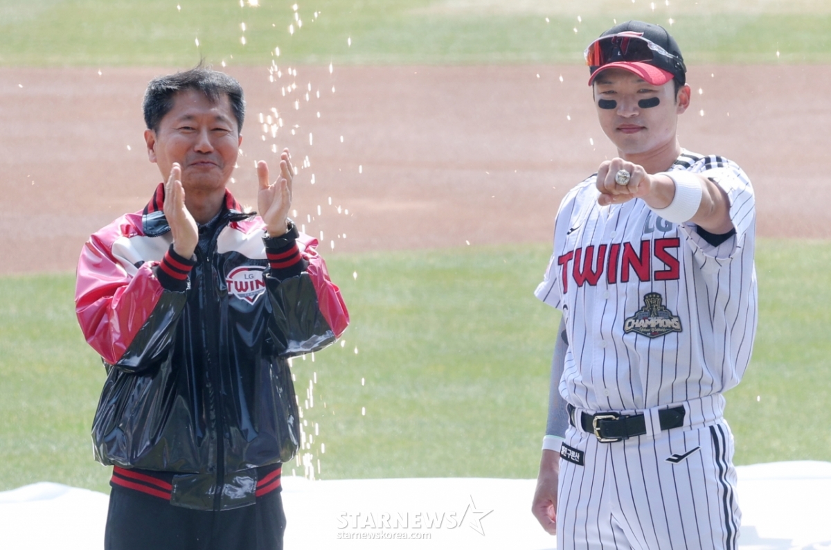 Капитан LG Пак Хэ Мин позирует после того, как представитель Ким Ин Сок вручил ему кольцо победы на церемонии передачи кольца, которая состоялась перед игрой.
