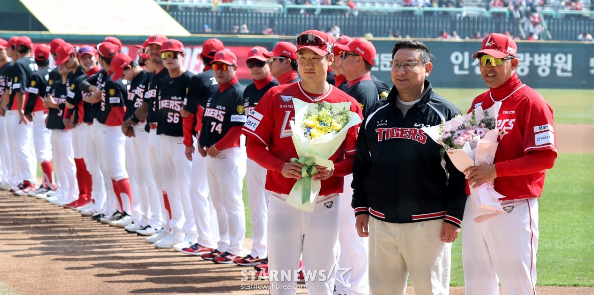 Тренер Киа Ли Бом Хо получает букет цветов вместе с О Тэ Гон от генерального директора Киа Шим Дже Хак на открытии профессионального бейсбольного матча SSG Landers и KIA Tigers 2026 на поле SSG Landers в Инчхоне 28-го числа. 2026.03.28.