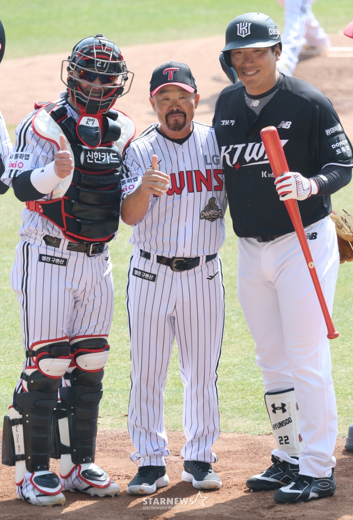 Тренер LG Ким Ён Иль снимает памятную фотографию с захватчиком Пак Дон Вон после того, как он сделал первый бросок против kt Ким Хён Су.