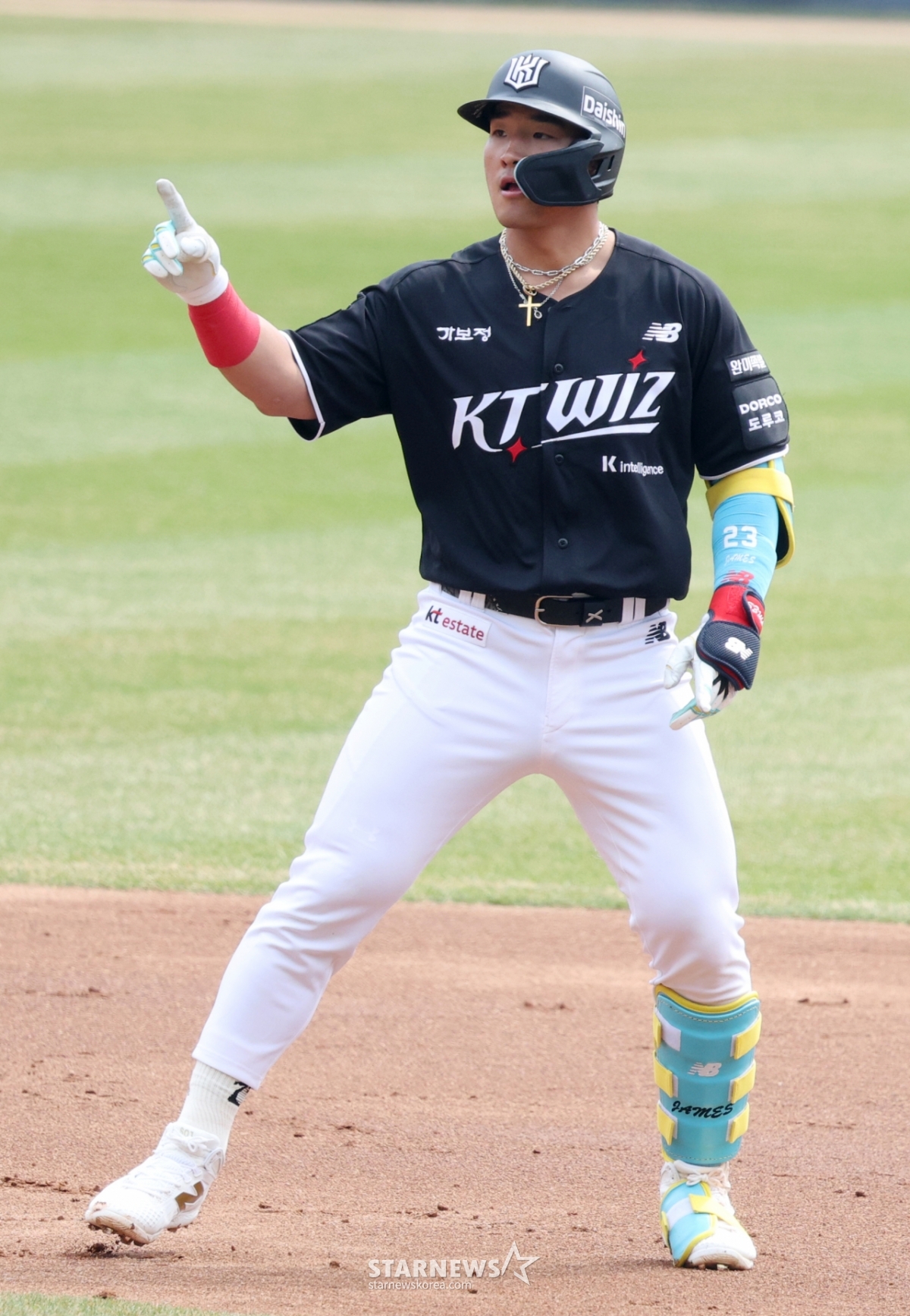 Ан Хёнмин, КТ, проводит церемонию после первого удара, первого удара и своевременного двойного удара с первой базы.